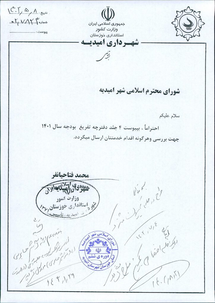 مصوبه شماره ۱ جلسه شماره ۷۱ شورای اسلامی شهر امیدیه