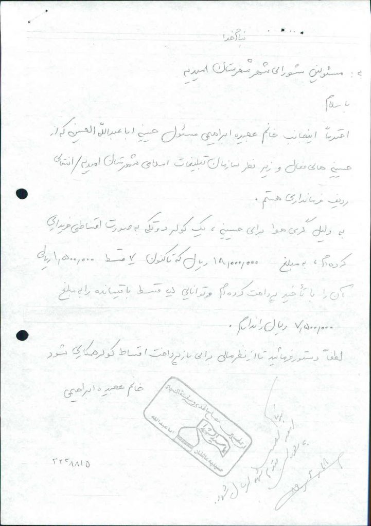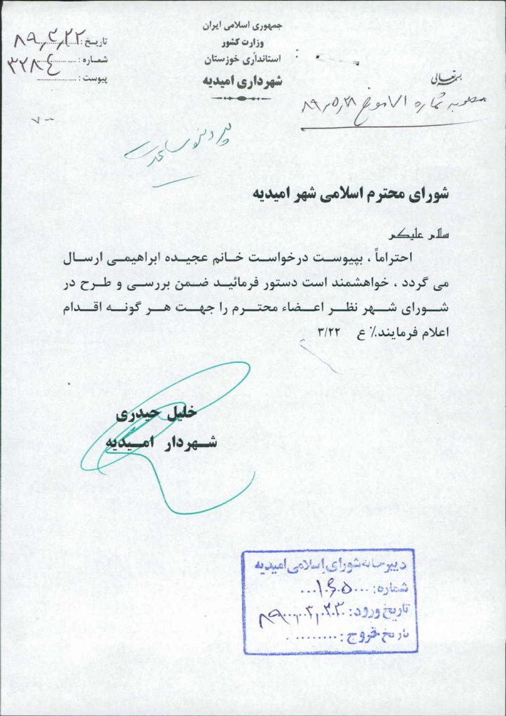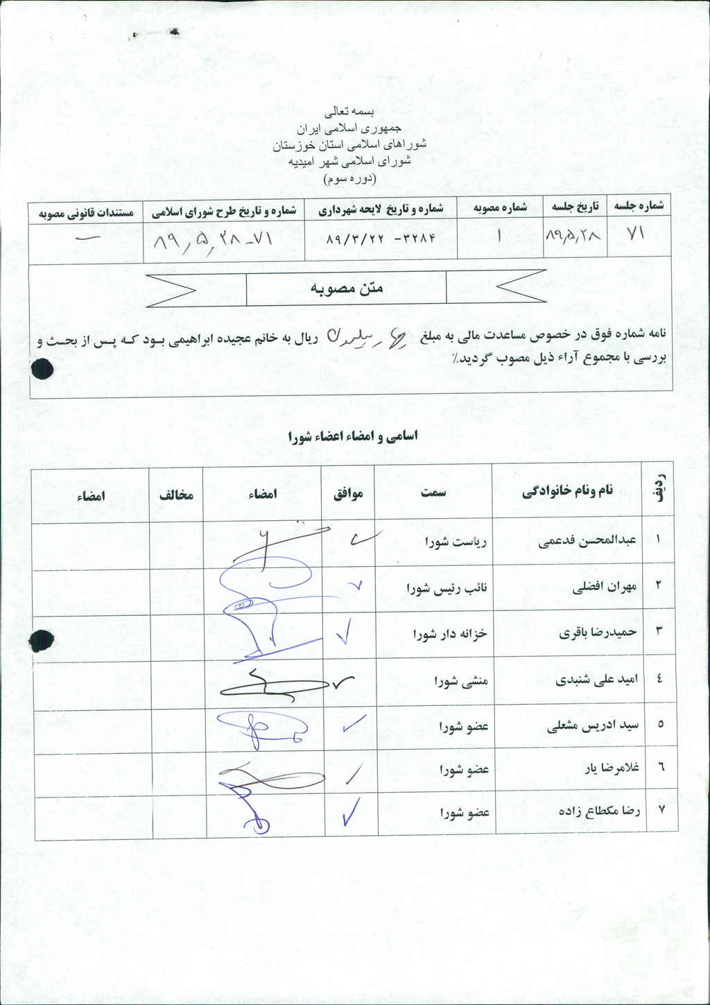 بسم الله الرحمن الرحیم مصوبه شماره ۱ جلسه شماره ۷۱ شورای اسلامی شهر امیدیه
