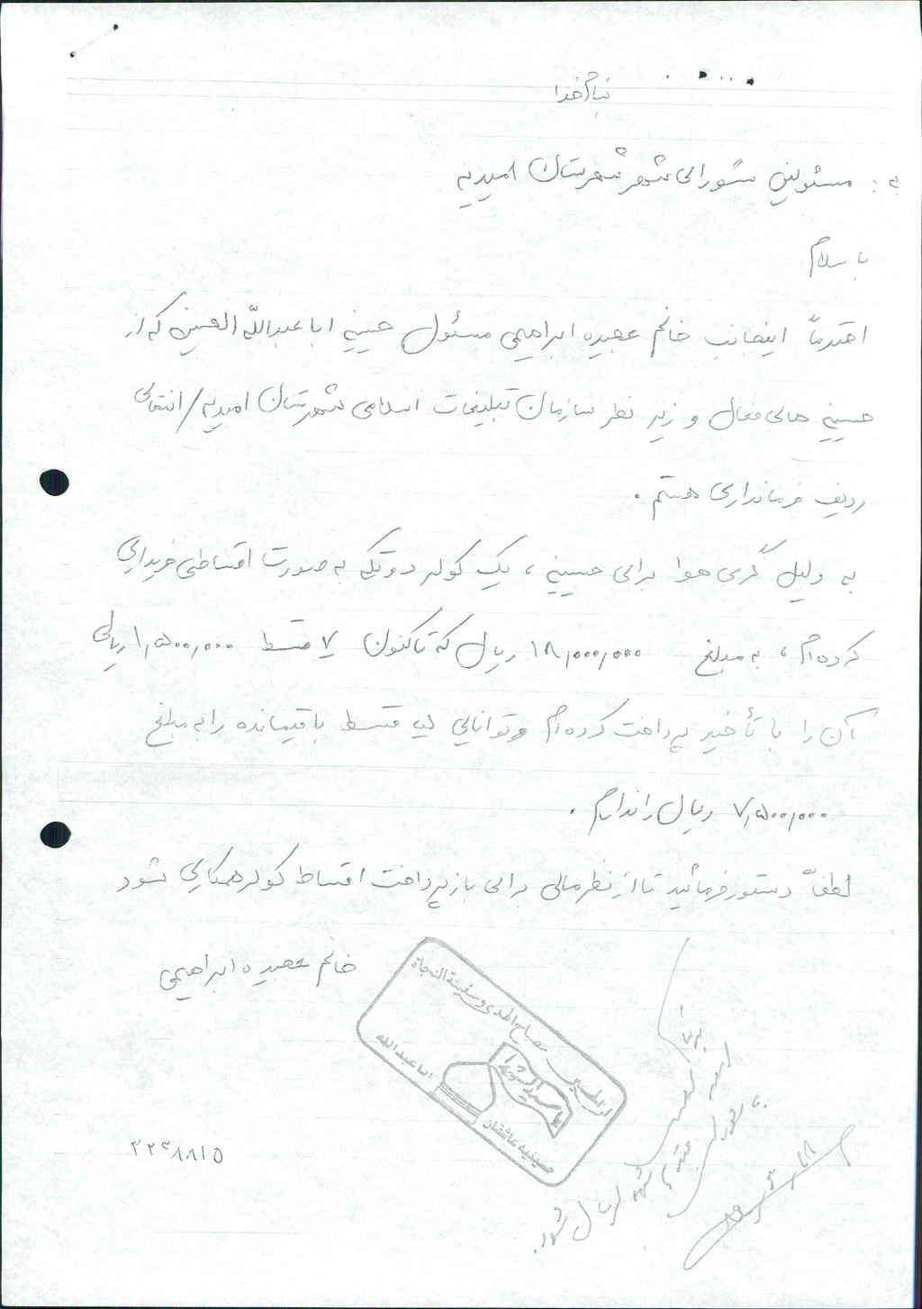 نامه شماره فوق در خصوص مساعدت مالی به مبلغ چهار میلیون ریال به خانم عجیده ابراهیمی بود که پس از بحث و بررسی با مجموع آراء ذیل مصوب گردید%