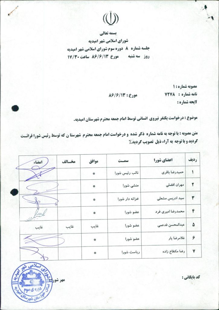 مصوبه شماره ۱ جلسه شماره ۸ شورای اسلامی شهر امیدیه