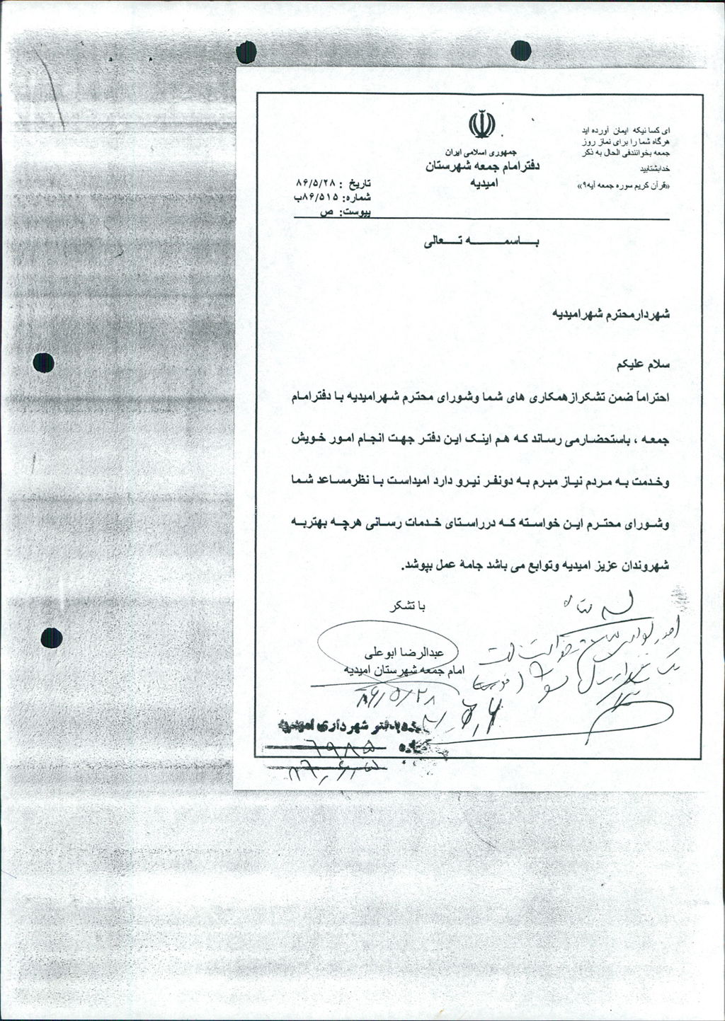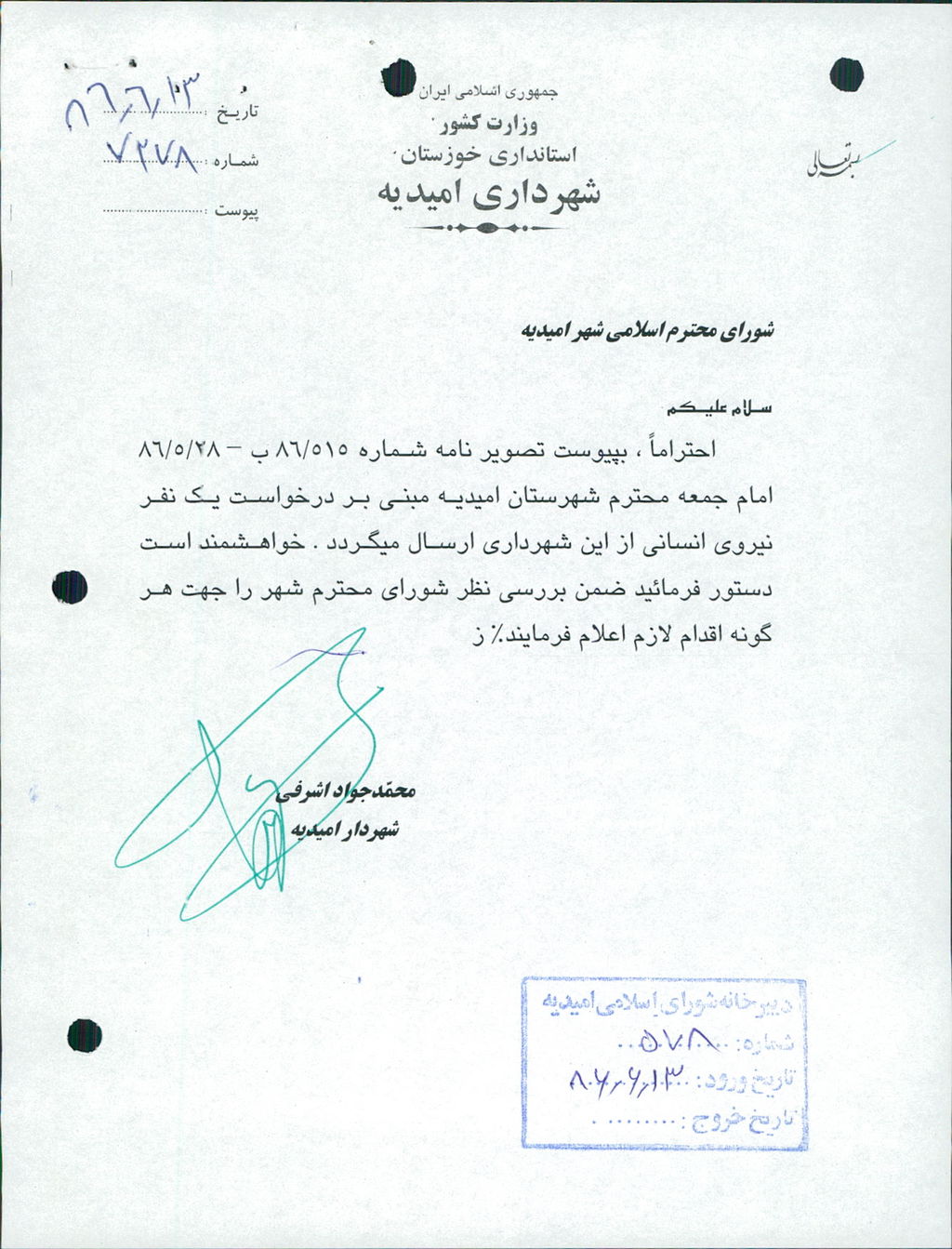 موضوع : درخواست يكنفر نيروي انساني توسط امام جمعه محترم شهرستان اميديه.