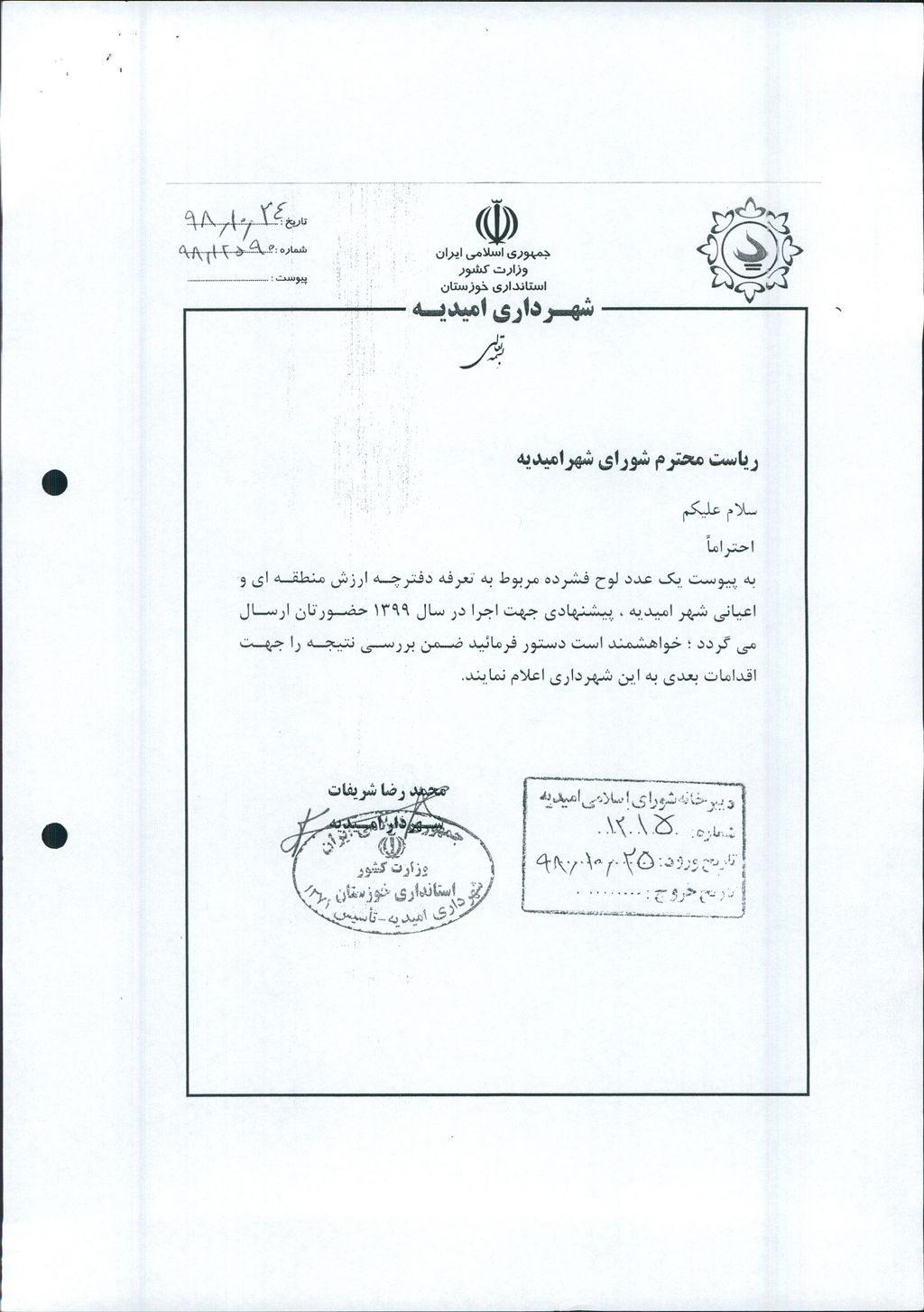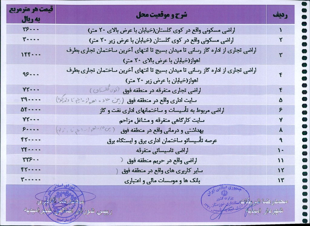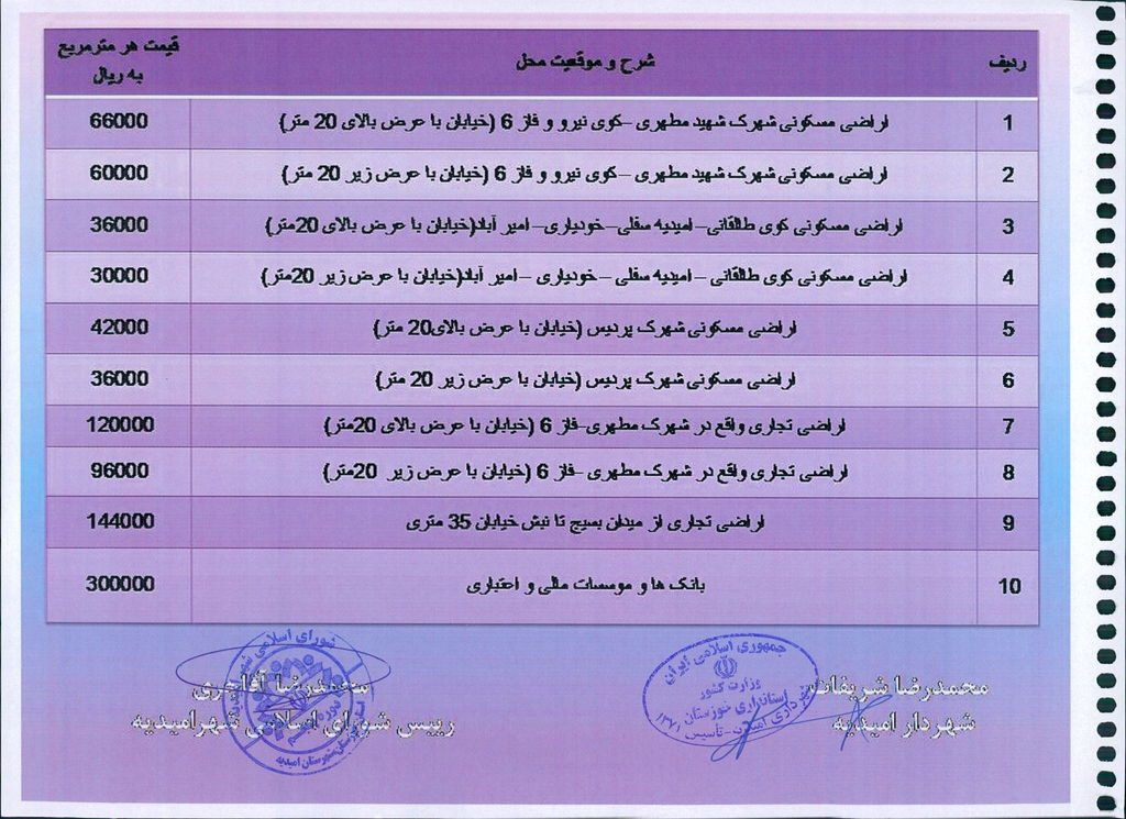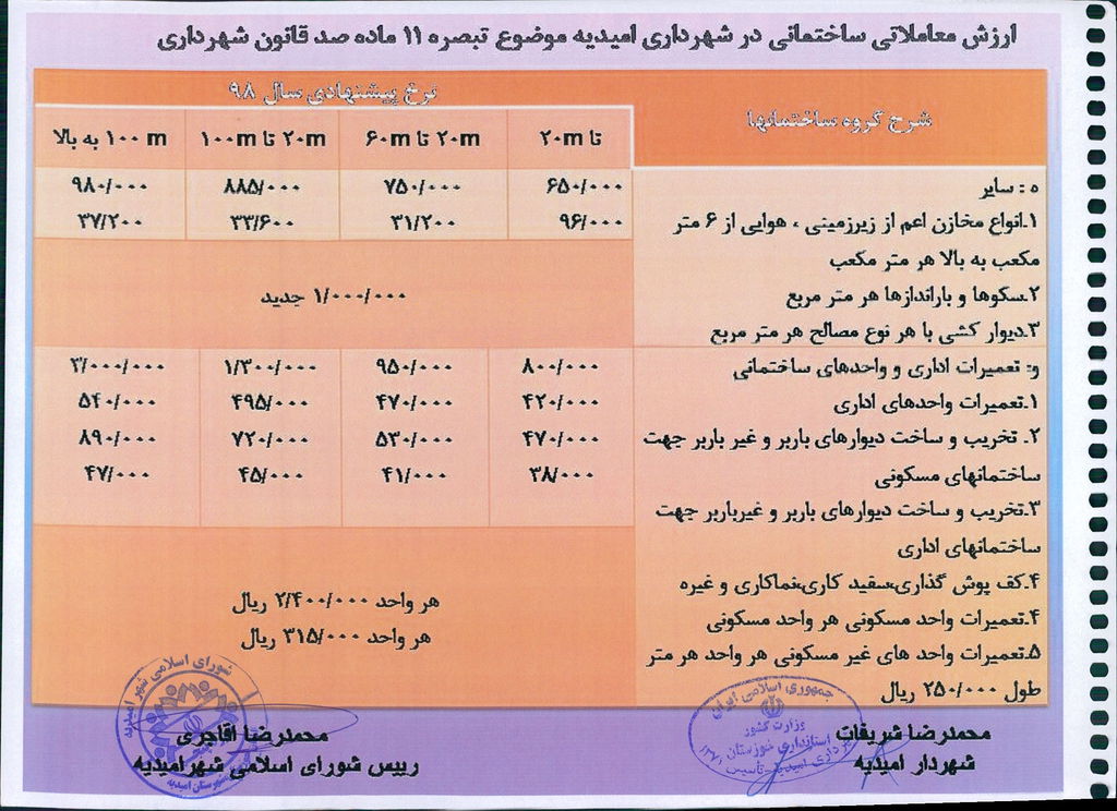 نامه شماره فوق شهرداری در خصوص یک جلد دفترچه ارزش منطقه ای عرصه و ارزش معاملاتی اعیانی محدوده و حریم شهر امیدیه مربوط به سال ۱۳۹۹ در جلسه مطرح و پس از بحث و بررسی با مجموع آراء ذیل مصوب گردید.