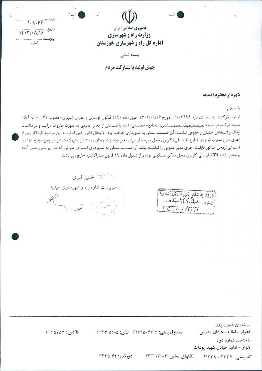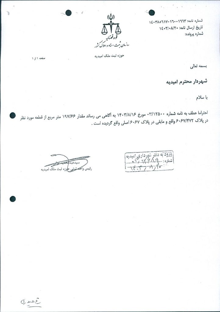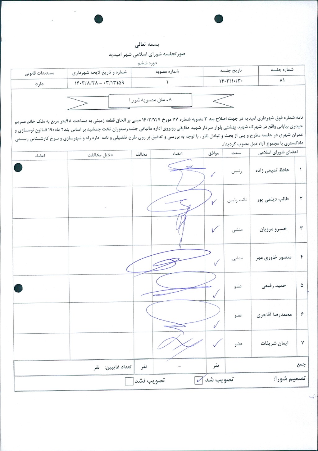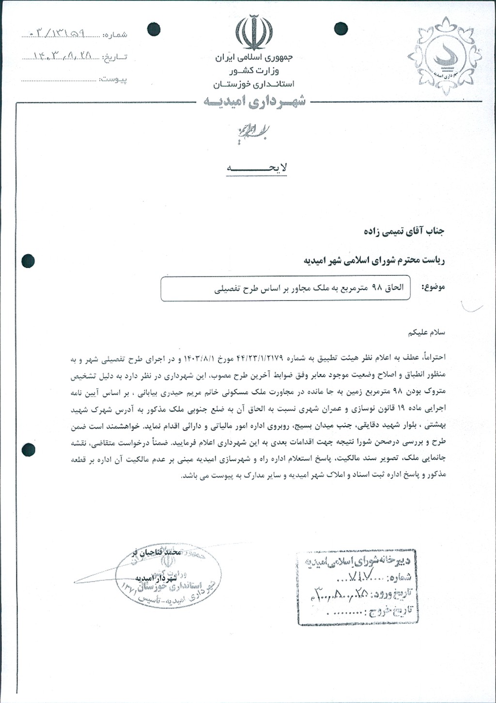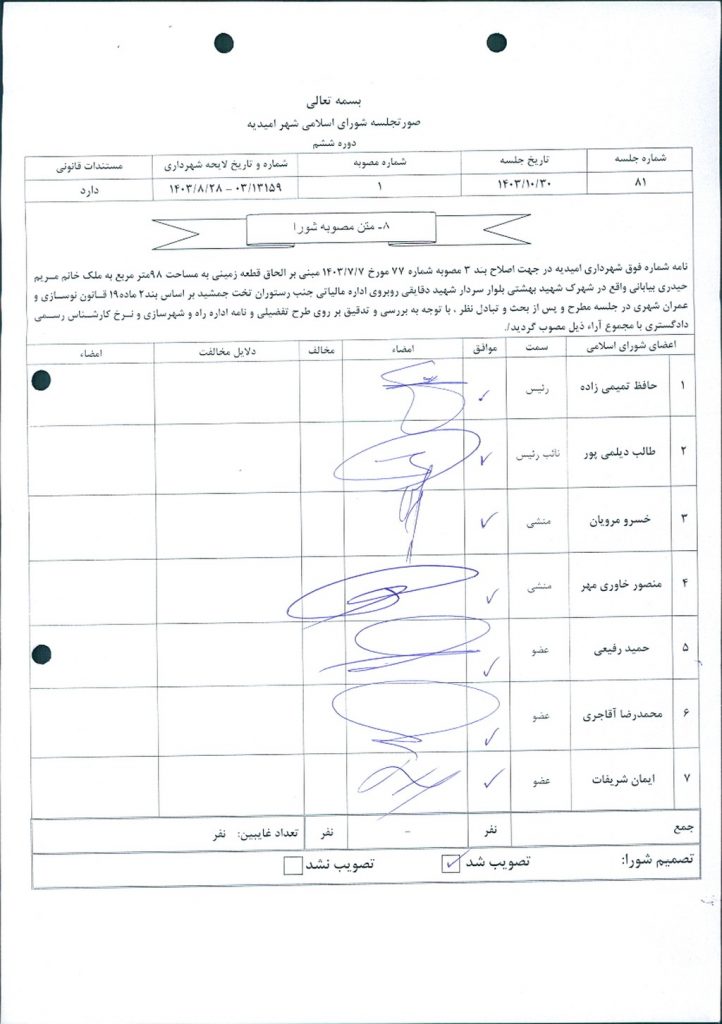 نامه شماره فوق شهرداري امیدیه در جهت اصلاح بند ۳ مصوبه شماره ۷۷ مورخ ۷/۷/ ۱۴۰۳ مبنی بر الحاق قطعه زمینی به مساحت ۹۸متر مربع به ملک خانم مریم حیدری بیابانی واقع در شهرک شهید بهشتی بلوار سردار شهید دقایقی روبروی اداره مالیاتی جنب رستوران تخت جمشید بر اساس بند۲ ماده۱۹ قانون نوسازی و عمران شهری در جلسه مطرح و پس از بحث و تبادل نظر ، با توجه به بررسی و تدقیق بر روی طرح تفضیلی و نامه اداره راه و شهرسازی و نرخ کارشناس رسمی دادگستری با مجموع آراء ذيل مصوب گرديد.