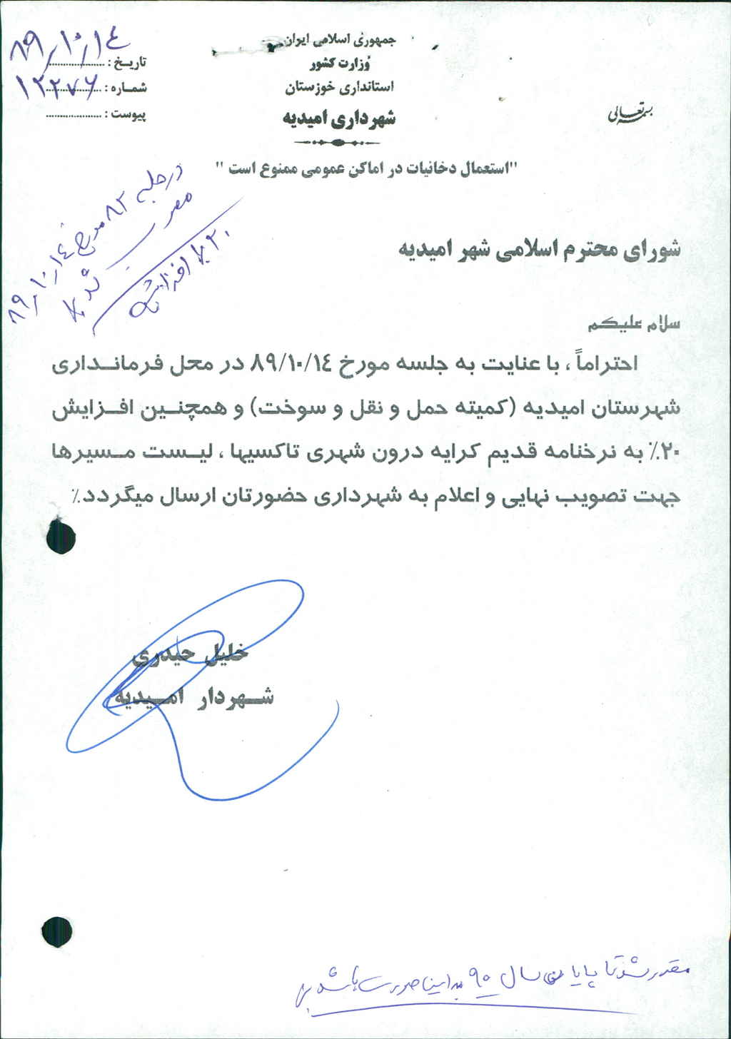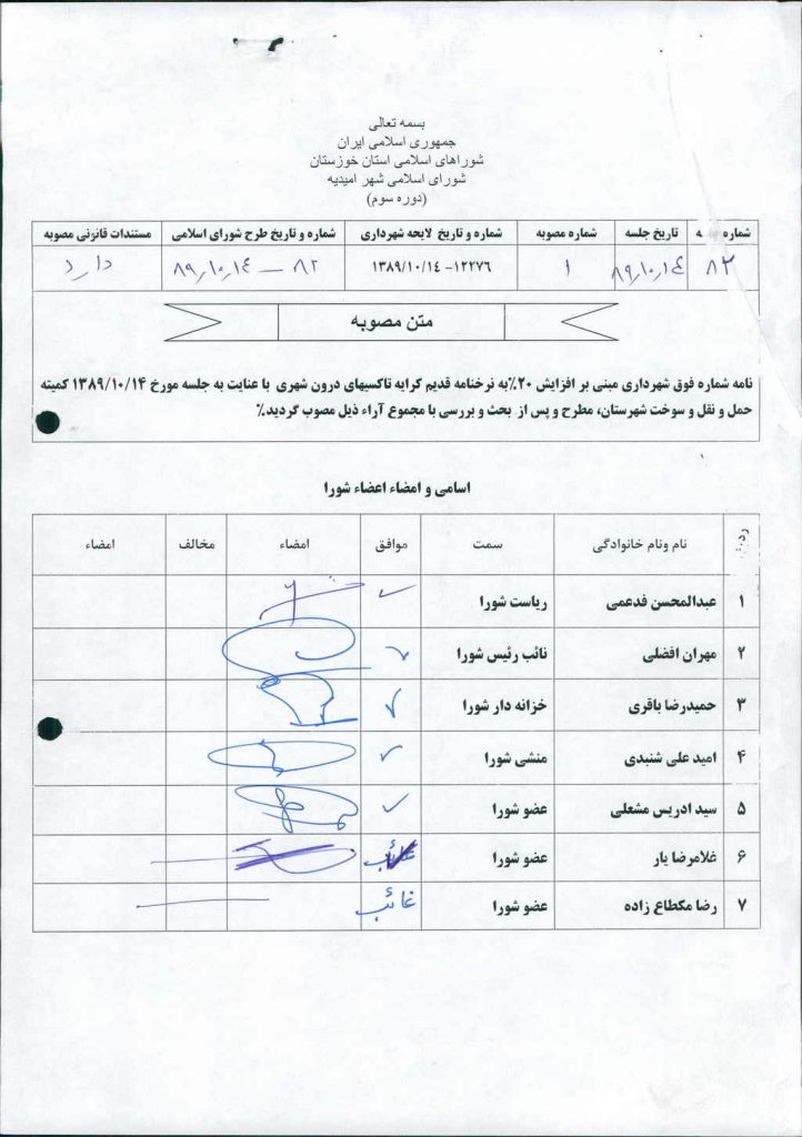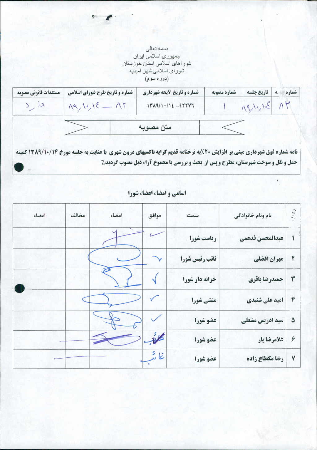 نامه شماره فوق شهرداری مبنی بر افزایش ۲۰%به نرخنامه قدیم کرایه تاکسیهای درون شهری با عنایت به جلسه مورخ ۱۳۸۹/۱۰/۱۴ کمیته حمل و نقل و سوخت شهرستان درجلسه مطرح و پس از بحث و بررسی با مجموع آراء ذیل مصوب گردید%