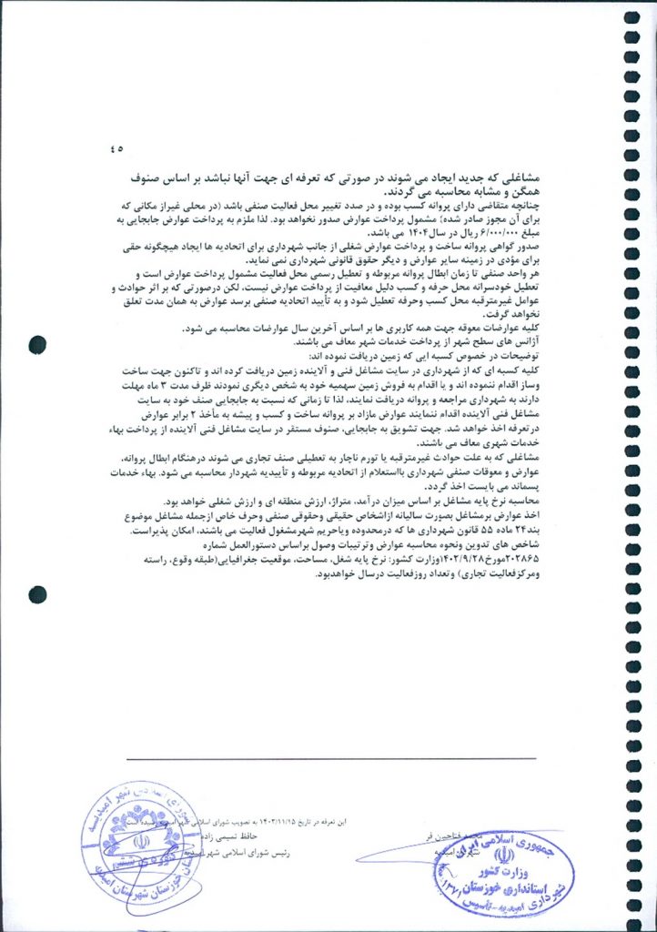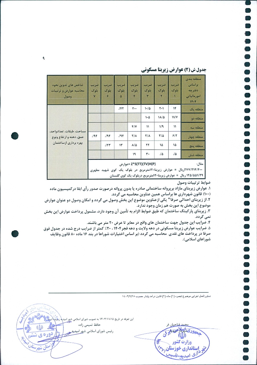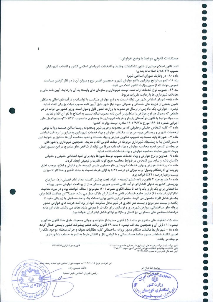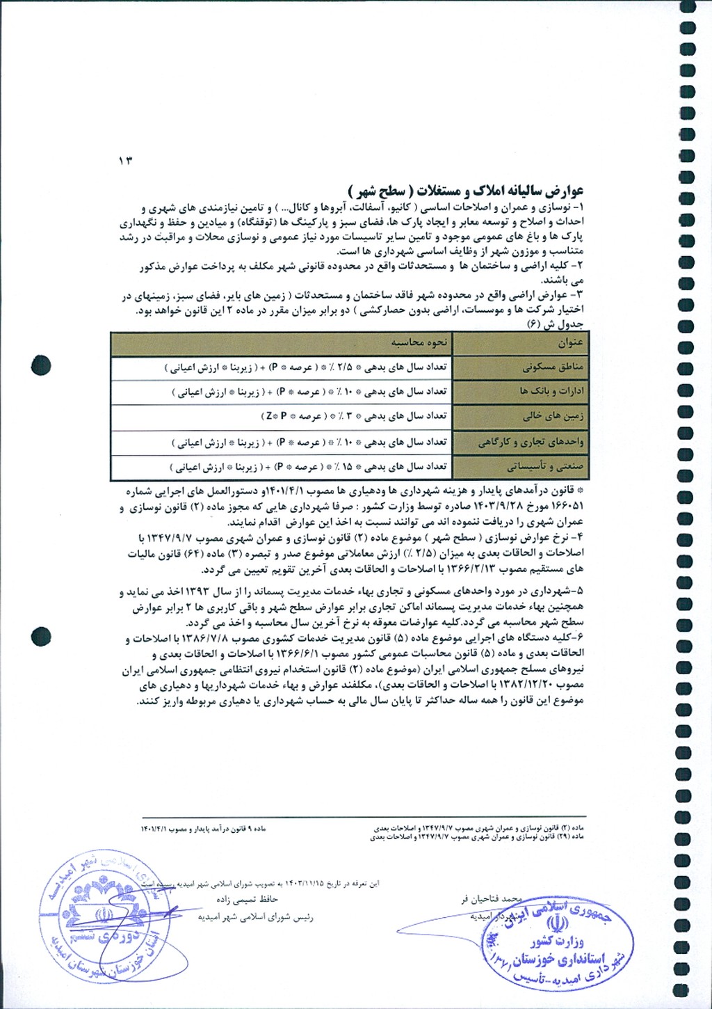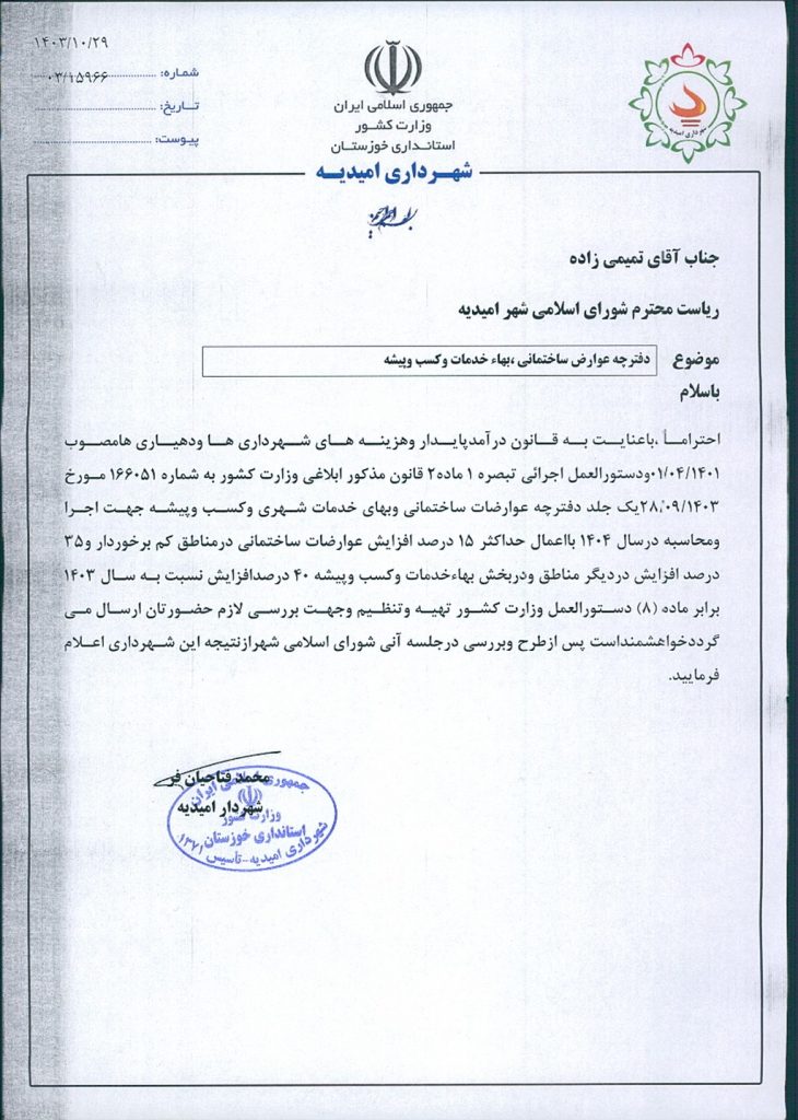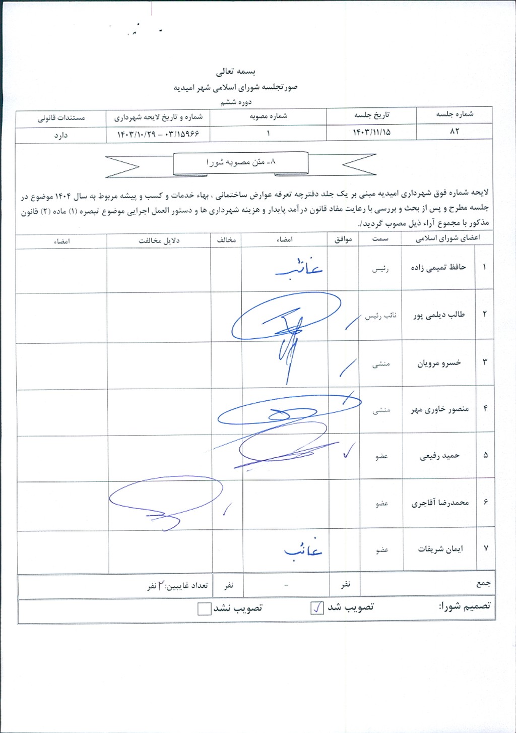 لایحه شماره فوق شهرداری امیدیه مبنی بر یک جلد دفترچه تعرفه عوارض ساختمانی ، بهاء خدمات و کسب و پیشه مربوط به سال ۱۴۰۴ موضوع در جلسه مطرح و پس از بحث و بررسی با رعایت مفاد قانون درآمد پایدار و هزینه شهرداری ها و دستور العمل اجرایی موضوع تبصره (۱) ماده (۲) قانون مذکور با مجموع آراء ذیل مصوب گردید