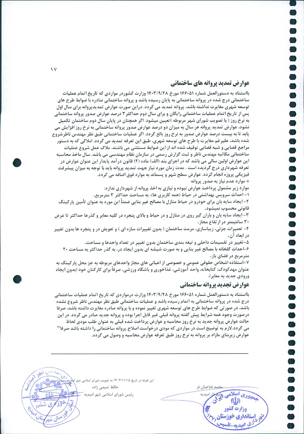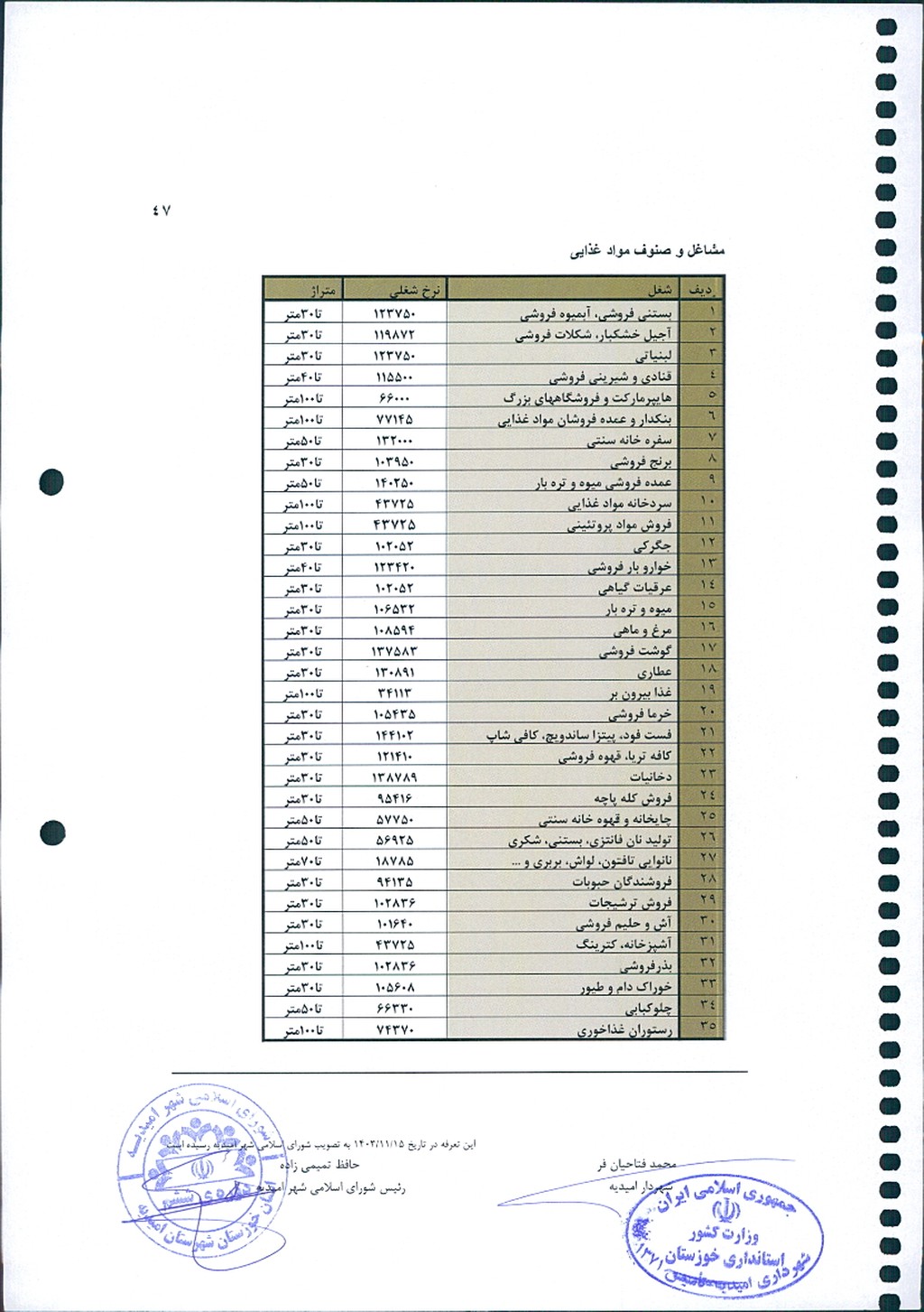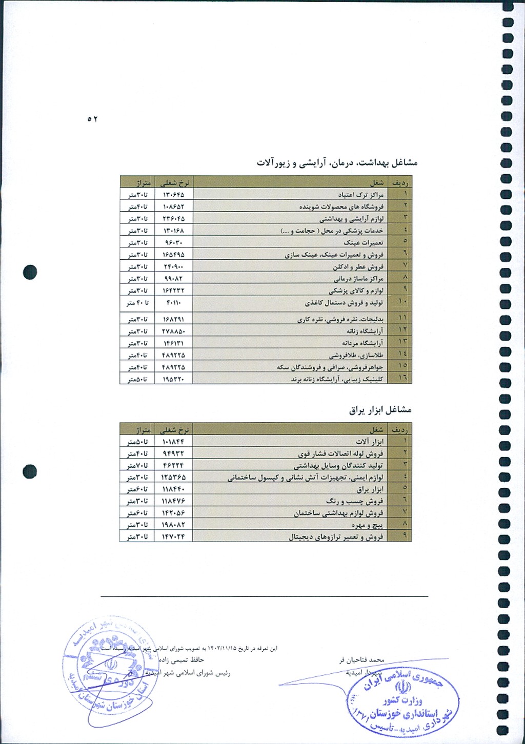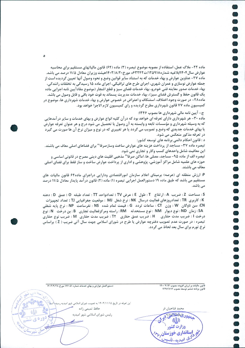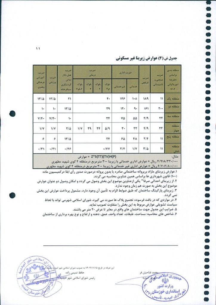 لایحه شماره فوق شهرداری امیدیه مبنی بر یک جلد دفترچه تعرفه عوارض ساختمانی ، بهاء خدمات و کسب و پیشه مربوط به سال ۱۴۰۴ موضوع در جلسه مطرح و پس از بحث و بررسی با رعایت مفاد قانون درآمد پایدار و هزینه شهرداری ها و دستور العمل اجرایی موضوع تبصره (۱) ماده (۲) قانون مذکور با مجموع آراء ذیل مصوب گردید