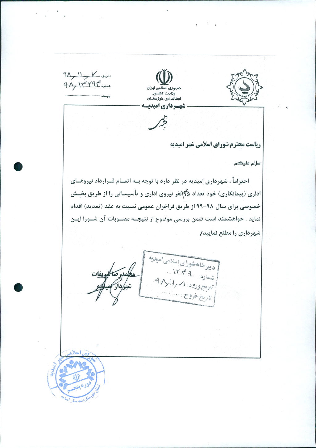 نامه شماره فوق مبنی بر اینکه شهرداری در نظر دارد، با عنایت به اتمام قرارداد پیمانکار جهت انجام امورخدماتی و اداری خود به تعداد ۱۴۵ نفر نیرو از طریق بخش خصوصی برای سال ۹۹-۹۸ از طریق فراخوان عمومی اقدام به عقد (تمدید) قرارداد نماید، موضوع در جلسه مطرح و پس از بحث و بررسی با مجموع آراء ذیل مصوب گردید.