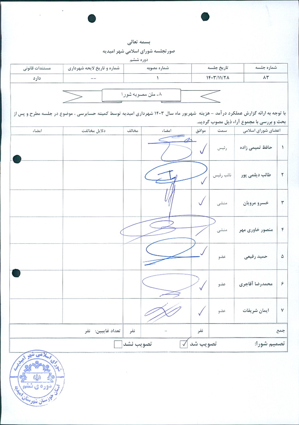 مصوبه شماره ۱ جلسه شماره ۸۳ مورخ ۱۴۰۳/۱۱/۲۸ شورای اسلامی شهر امیدیه