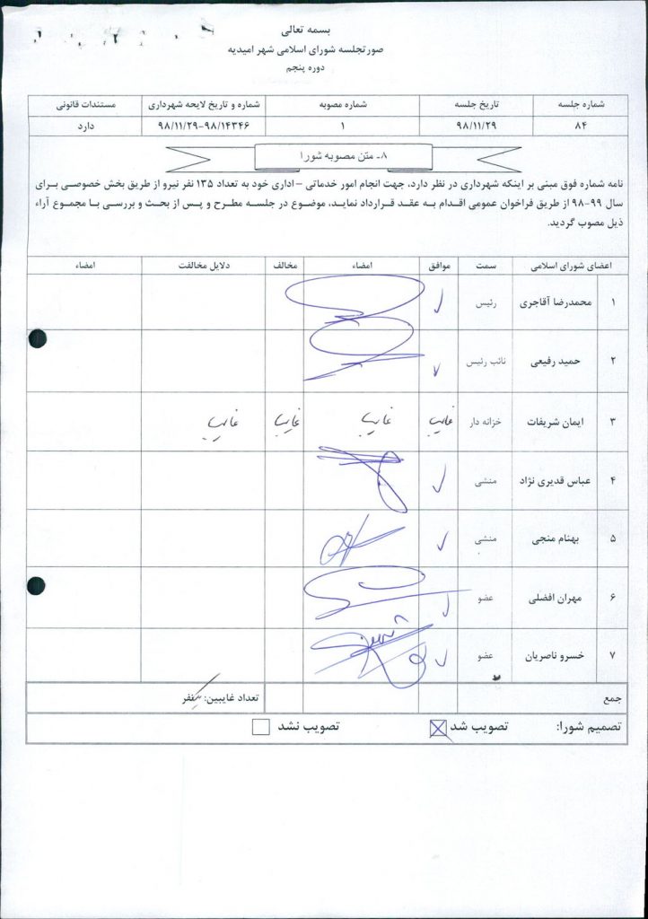 مصوبه شماره ۱جلسه شماره ۸۴ شورای اسلامی شهر امیدیه