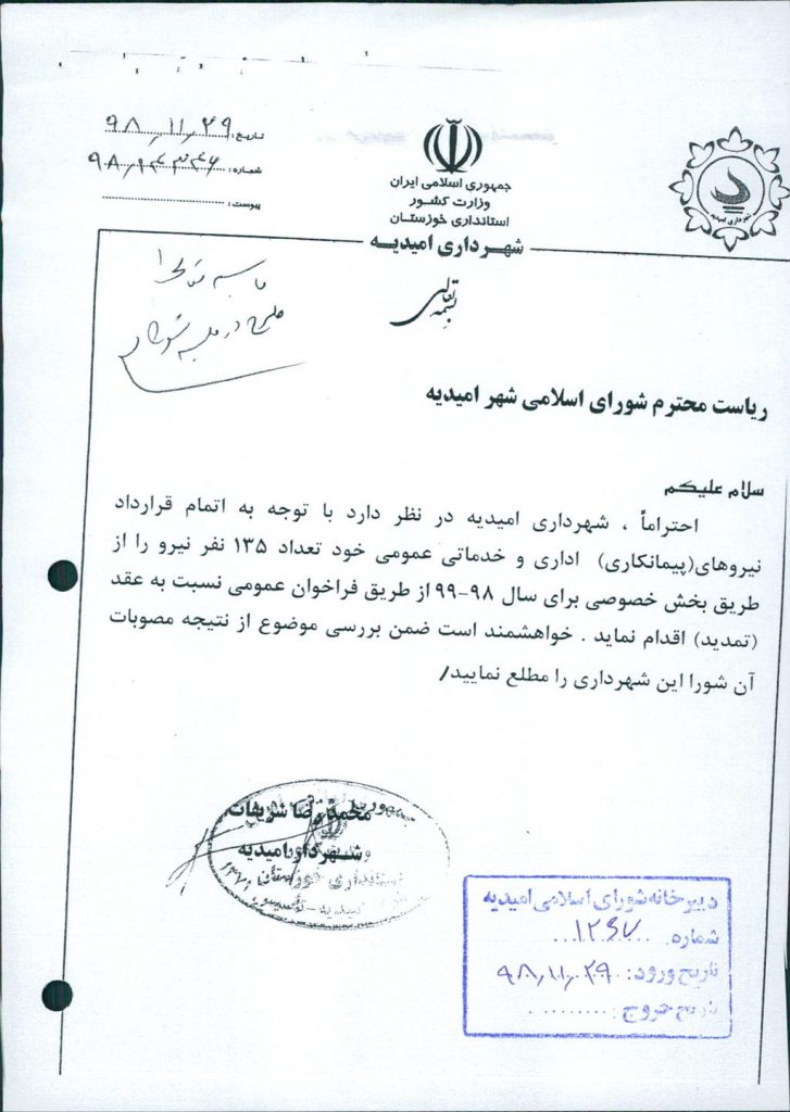 نامه شماره فوق مبنی بر اینکه شهرداری در نظر دارد، جهت انجام امور خدماتی – اداری خود به تعداد ۱۳۵ نفر نیرو از طریق بخش خصوصی برای سال ۹۹-۹۸ از طریق فراخوان عمومی اقدام به عقد قرارداد نماید، موضوع در جلسه مطرح و پس از بحث و بررسی با مجموع آراء ذیل مصوب گردید.
