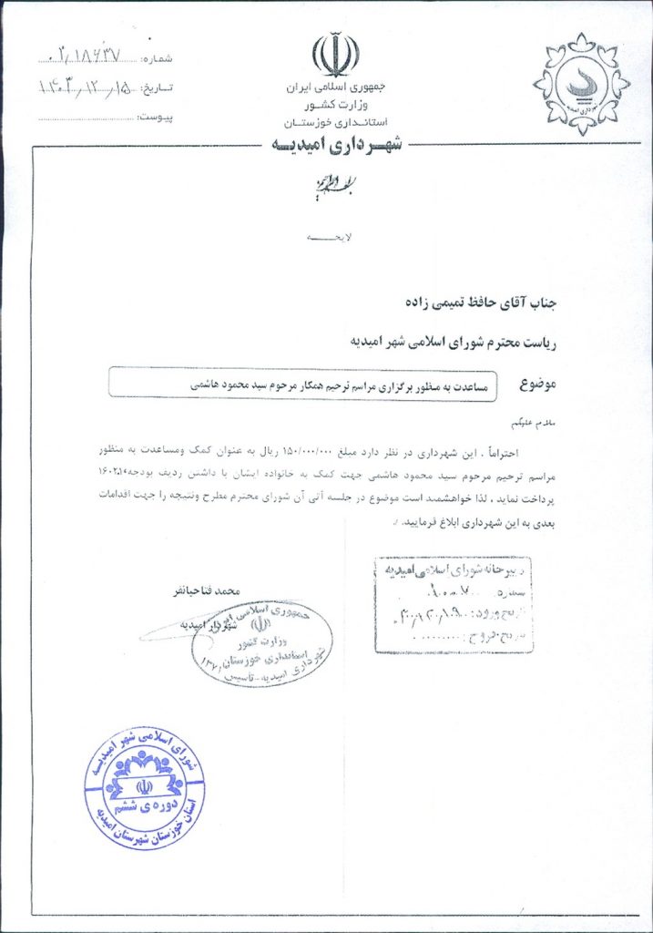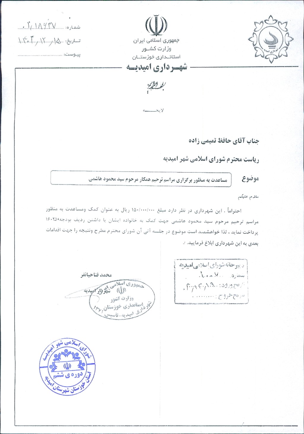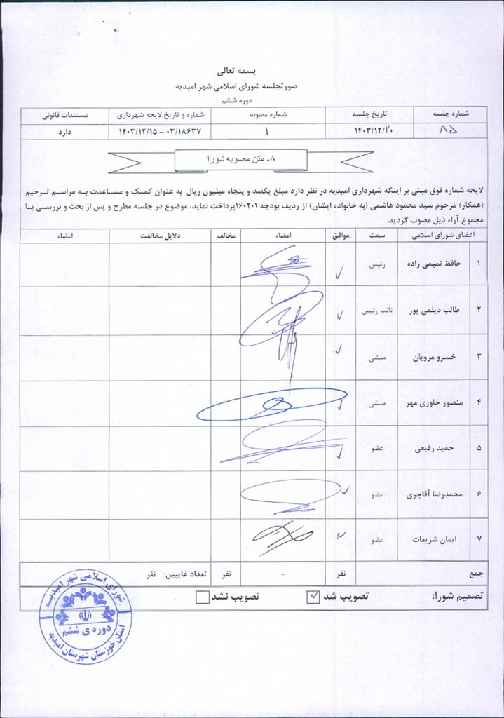 لایحه شماره فوق مبنی بر اینکه شهرداری امیدیه در نظر دارد مبلغ یکصد و پنجاه میلیون ريال به عنوان کمک و مساعدت به مراسم ترحیم (همکار) مرحوم سید محمود هاشمی (به خانواده ایشان) از ردیف بودجه ۱۶۰۲۰۱پرداخت نماید، موضوع در جلسه مطرح و پس از بحث و بررسی با مجموع آراء ذیل مصوب گردید.