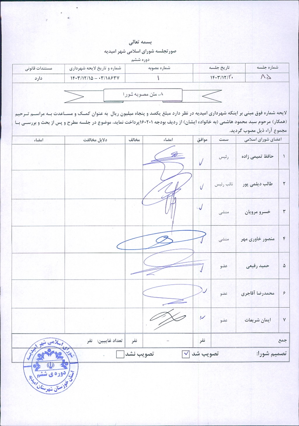 مصوبه شماره ۱ جلسه شماره ۸۵ شورای اسلامی شهر امیدیه