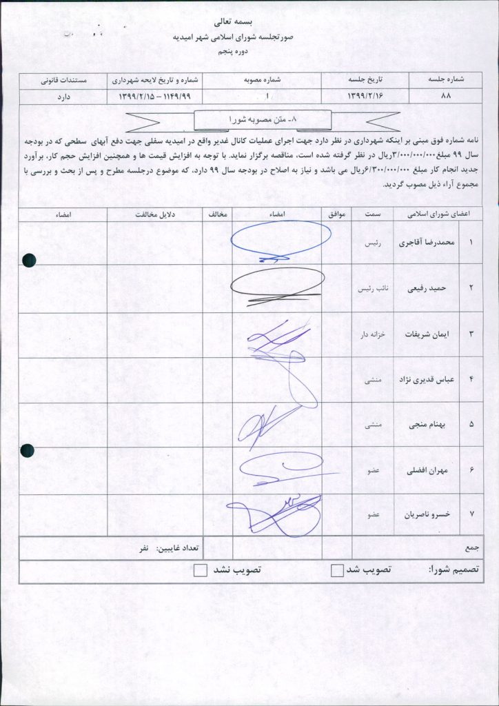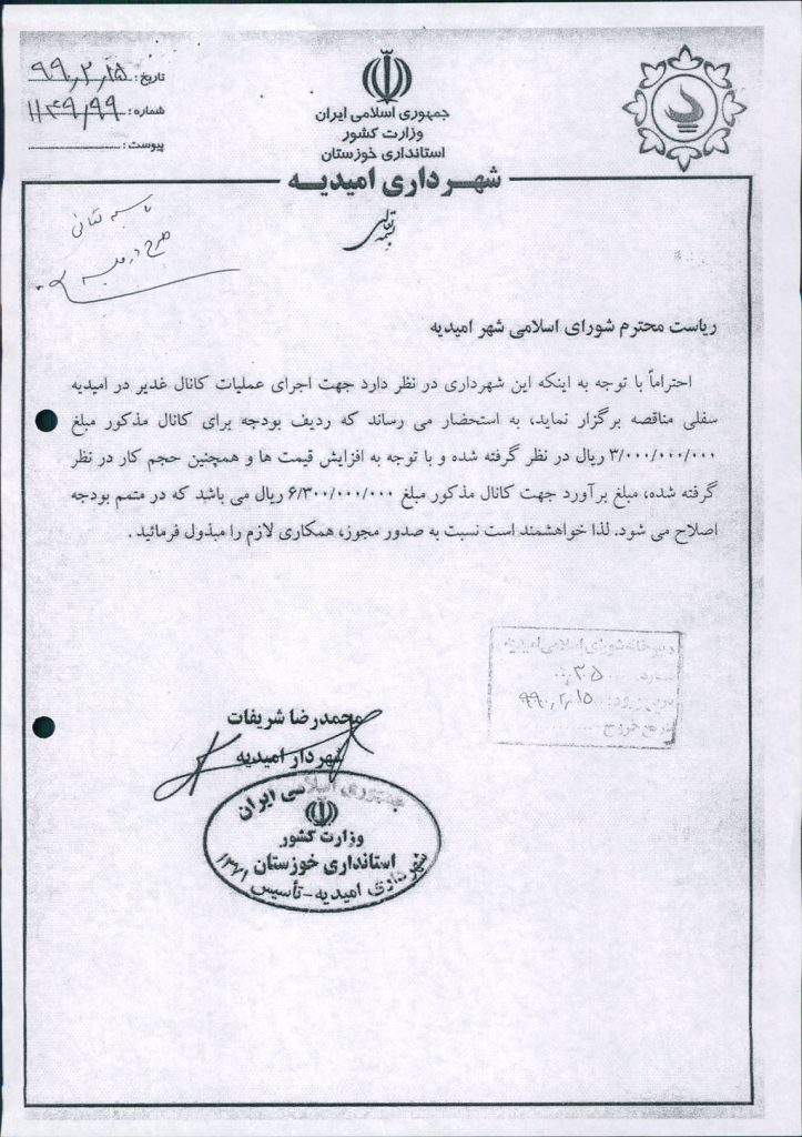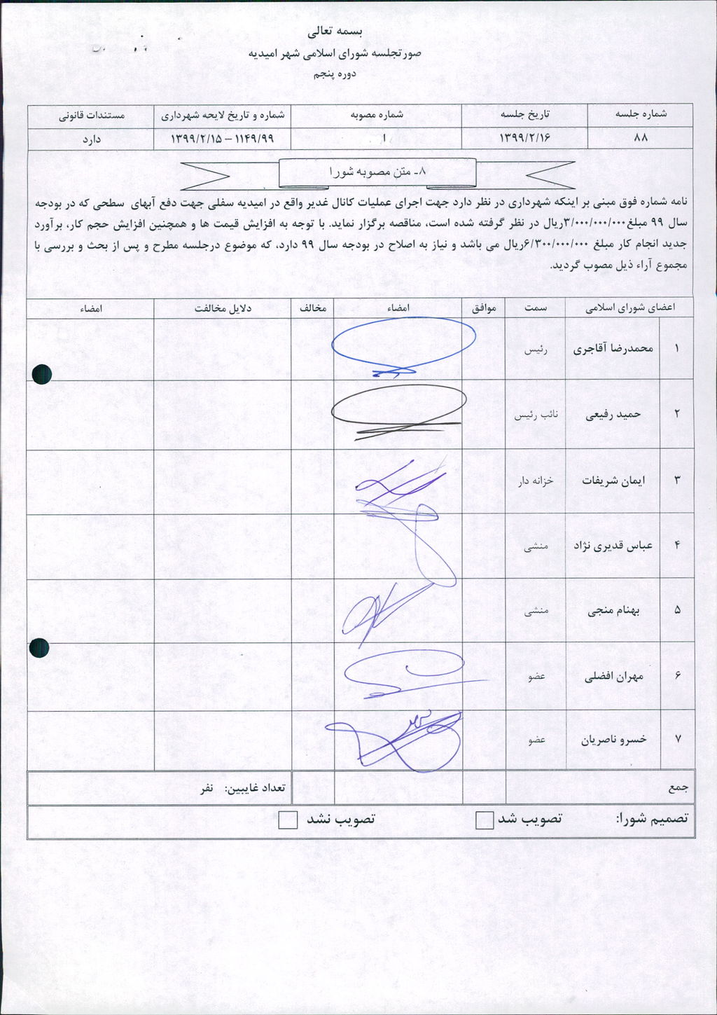 نامه شماره فوق مبنی بر اینکه شهرداری در نظر دارد جهت اجرای عملیات کانال غدیر واقع در امیدیه سفلی جهت دفع آبهای سطحی که در بودجه سال ۹۹ مبلغ۳۰۰۰۰۰۰۰۰۰ريال در نظر گرفته شده است، مناقصه برگزار نماید. با توجه به افزایش قیمت ها و همچنین افزایش حجم کار، برآورد جدید انجام کار مبلغ ۶۳۰۰۰۰۰۰۰۰ريال می باشد و نیاز به اصلاح در بودجه سال ۹۹ دارد، که موضوع درجلسه مطرح و پس از بحث و بررسی با مجموع آراء ذیل مصوب گردید.