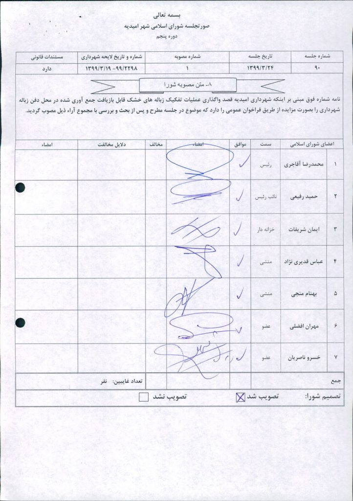 مصوبه شماره ۱ جلسه شماره ۹۰ شورای اسلامی شهر امیدیه