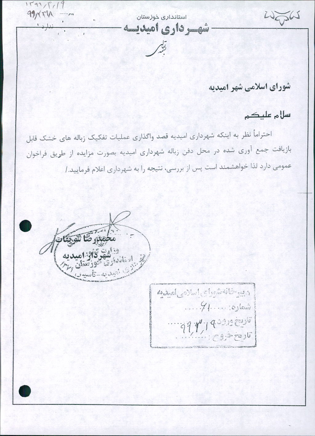 نامه شماره فوق مبنی بر اینکه شهرداری امیدیه قصد واگذاری عملیات تفکیک زباله های خشک قابل بازیافت جمع آوری شده در محل دفن زباله شهرداری را بصورت مزایده از طریق فراخوان عمومی را دارد که موضوع در جلسه مطرح و پس از بحث و بررسی با مجموع آراء ذیل مصوب گردید.
