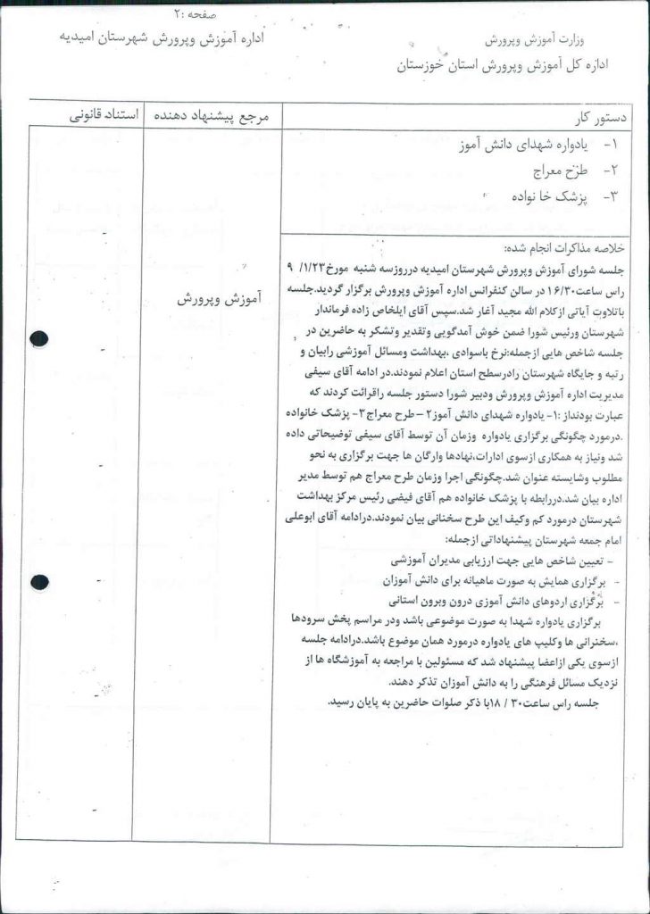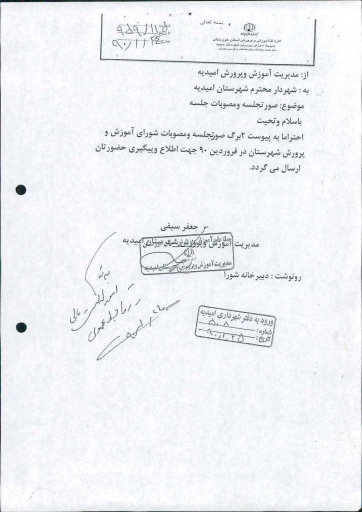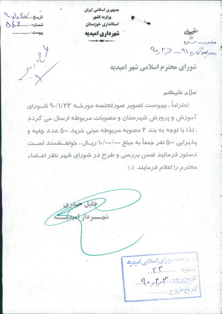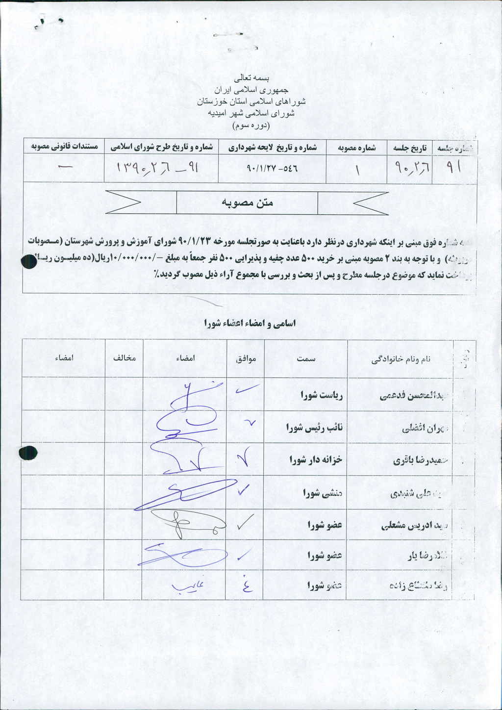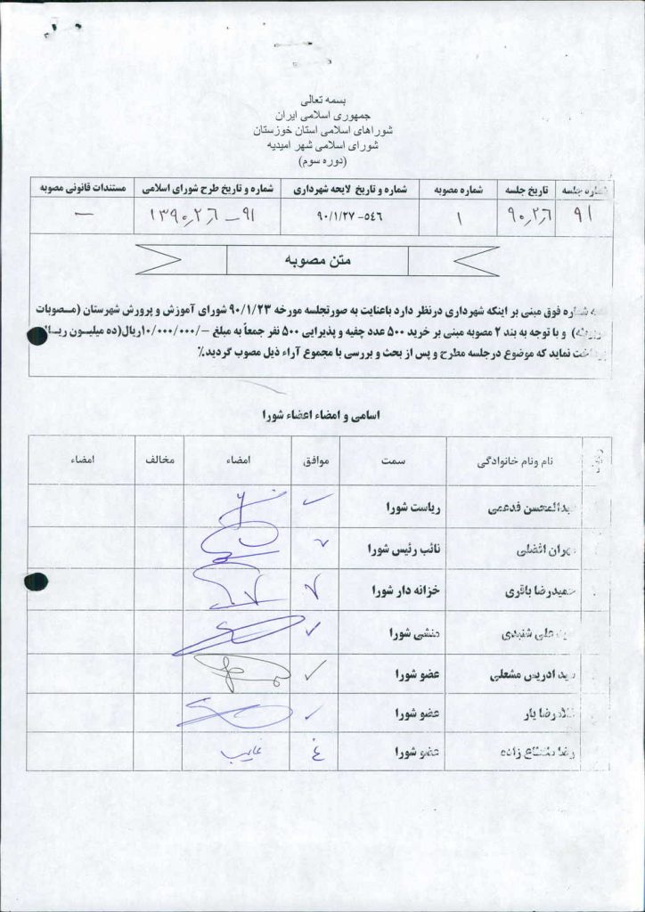 مصوبه شماره ۱ جلسه شماره ۹۱ شورای اسلامی شهر امیدیه