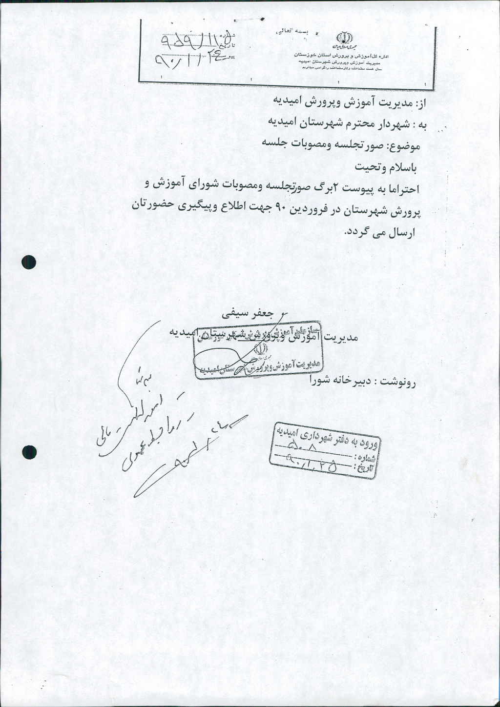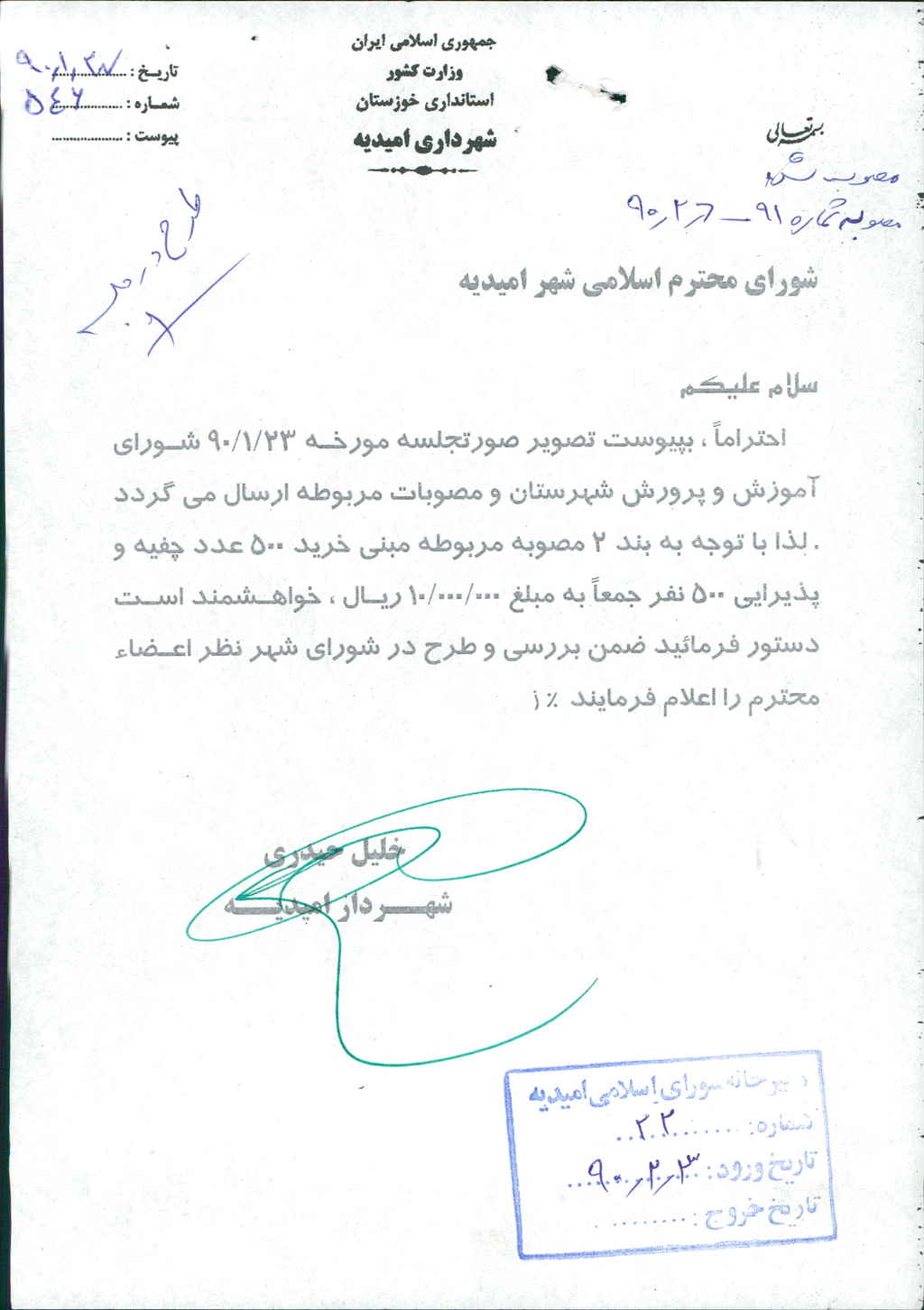 نامه شماره فوق مبنی بر اینکه شهرداری درنظر دارد باعنایت به صورتجلسه مورخه ۹۰/۱/۲۳ شورای آموزش و پرورش شهرستان (مصوبات مربوطه) و با توجه به بند ۲ مصوبه مبنی بر خرید ۵۰۰ عدد چفیه و پذیرایی ۵۰۰ نفر جمعاً به مبلغ -/۰۰۰/۰۰۰/ ۱۰ريال(ده میلیون ریال) پرداخت نماید که موضوع درجلسه مطرح و پس از بحث و بررسی با مجموع آراء ذیل مصوب گردید%