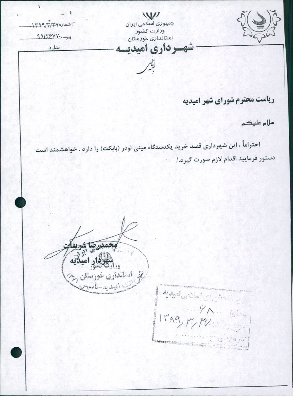 نامه شماره فوق مبنی بر اینکه شهرداری در نظر دارد نسبت به خرید یکدستگاه مینی لودر(بابکت) اقدام نماید، موضوع در جلسه مطرح و پس از بحث و بررسی با مجموع آراء ذیل مصوب گردید.