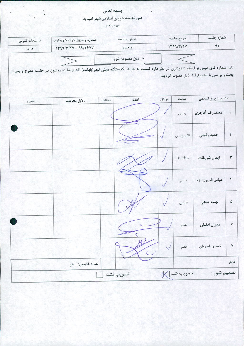 مصوبه شماره ۱ جلسه شماره ۹۱ شورای اسلامی شهر امیدیه