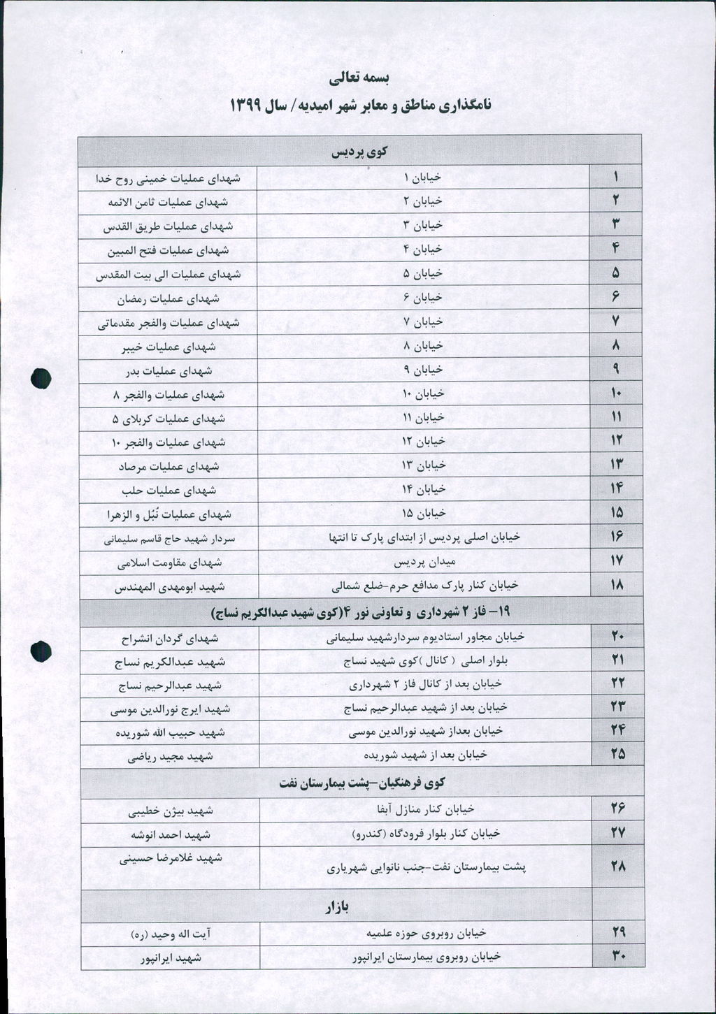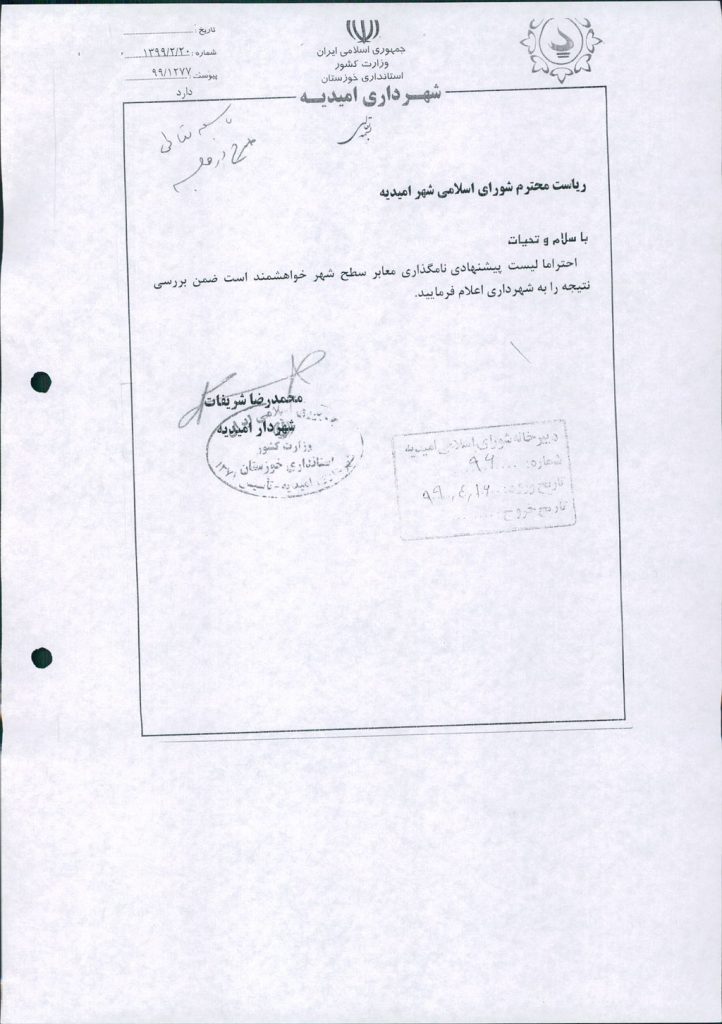 بسم الله الرحمن الرحیم مصوبه شماره ۱ جلسه شماره ۹۲ شورای اسلامی شهر امیدیه