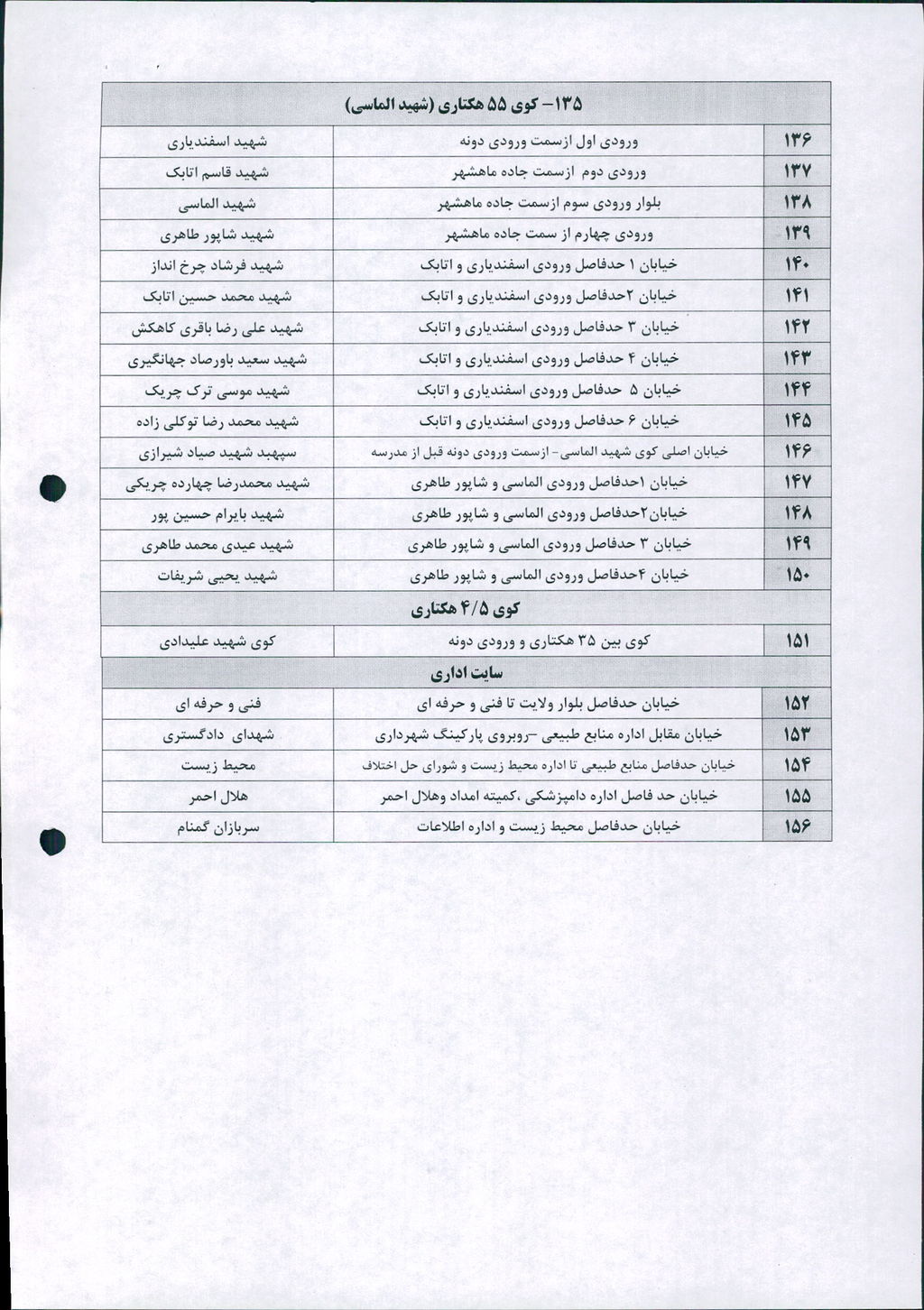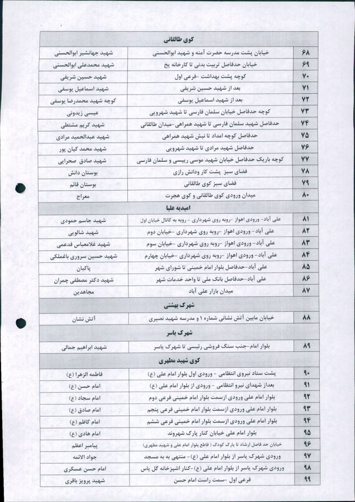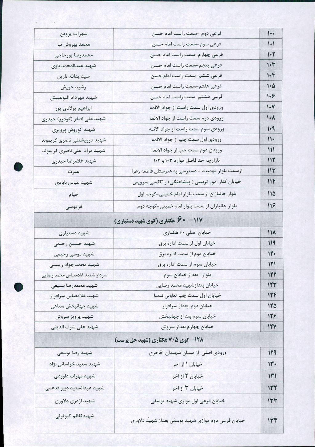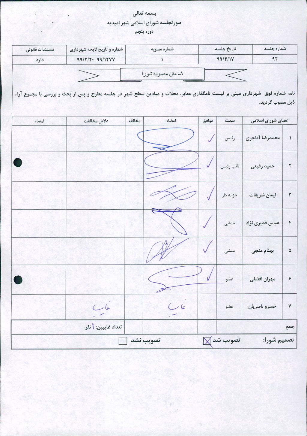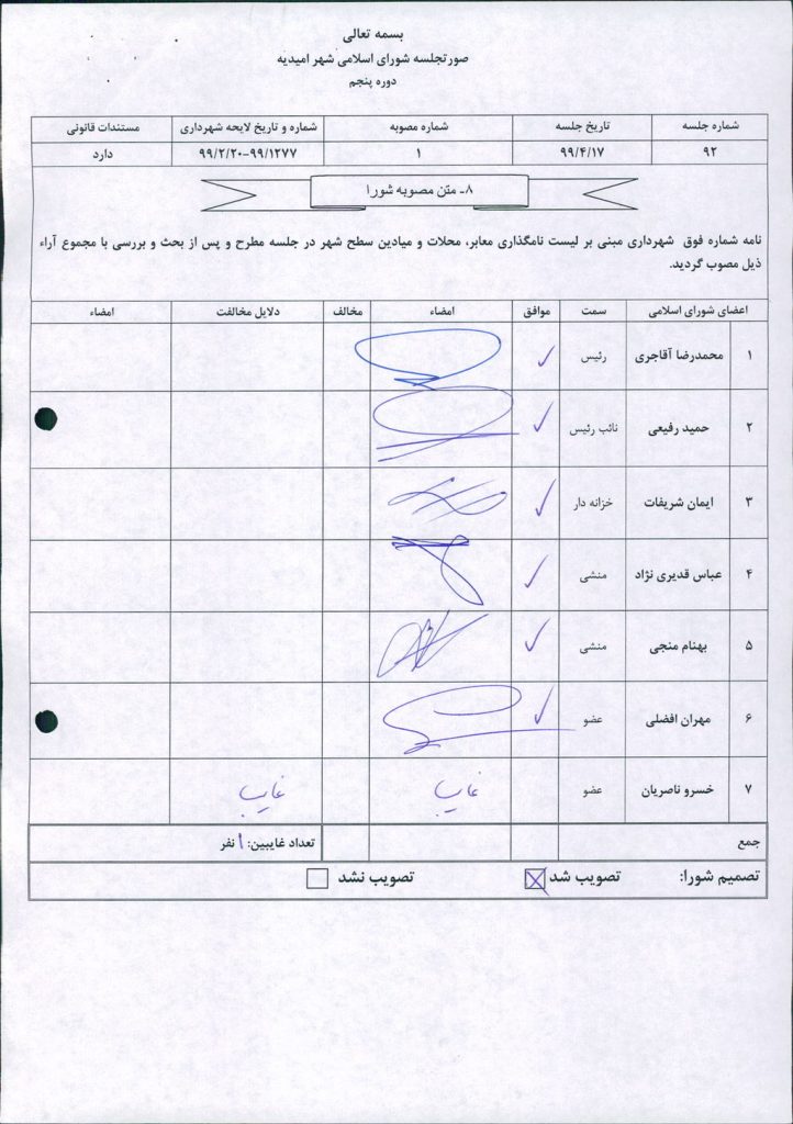 نامه شماره فوق شهرداری مبنی بر لیست نامگذاری معابر، محلات و میادین سطح شهر در جلسه مطرح و پس از بحث و بررسی با مجموع آراء ذیل مصوب گردید.