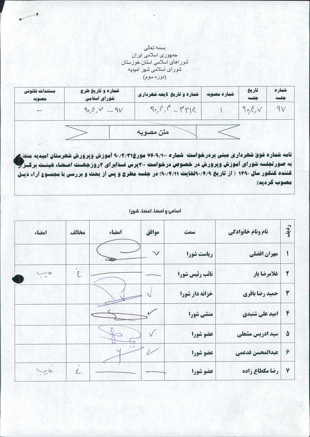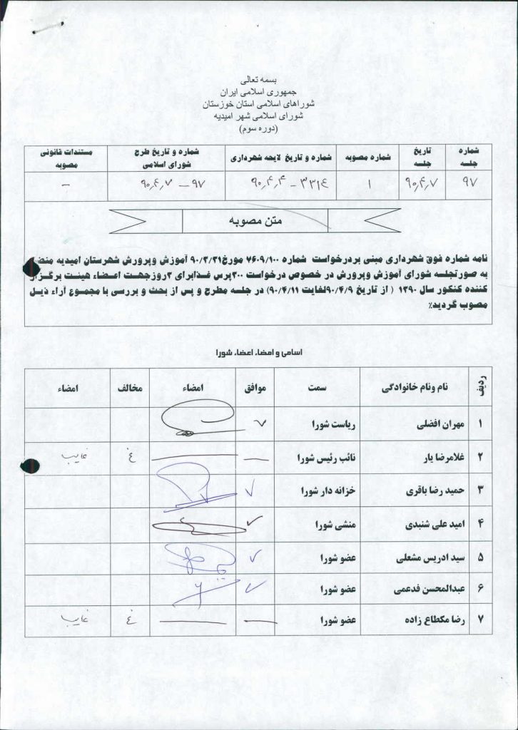 مصوبه شماره ۱ جلسه شماره ۹۷ شورای اسلامی شهر امیدیه