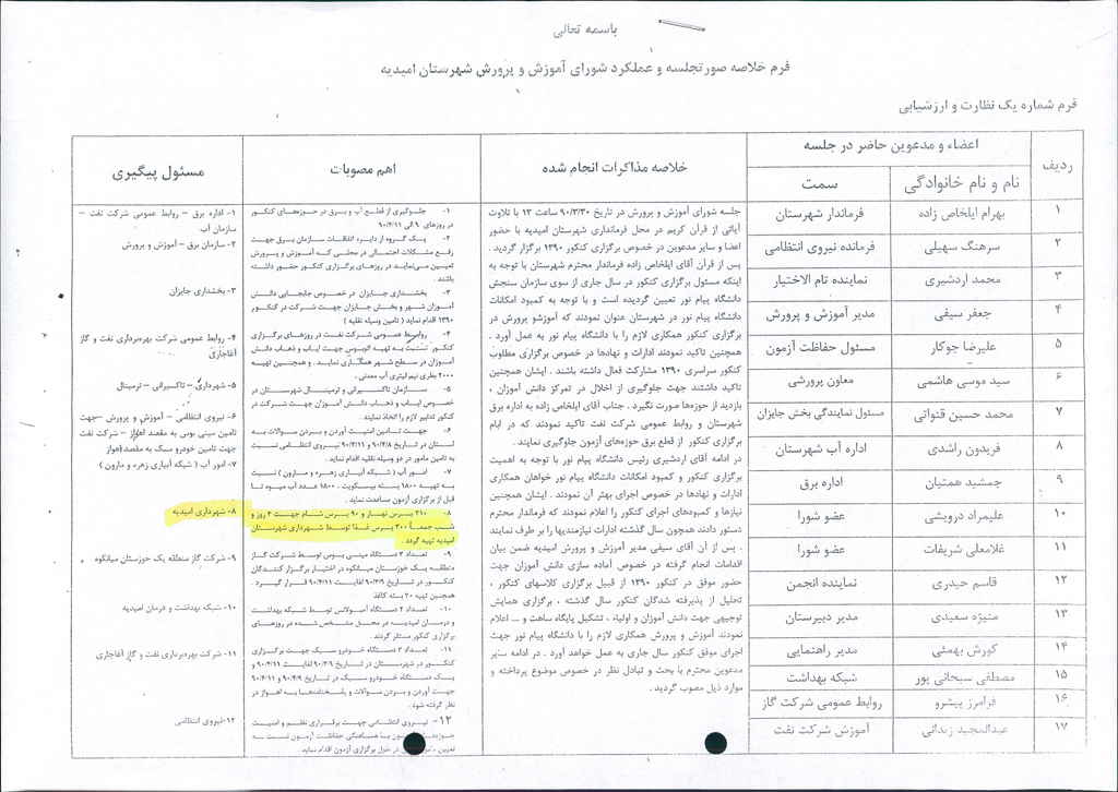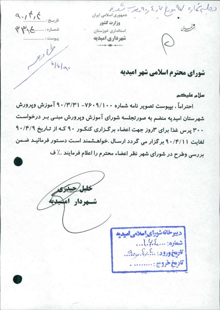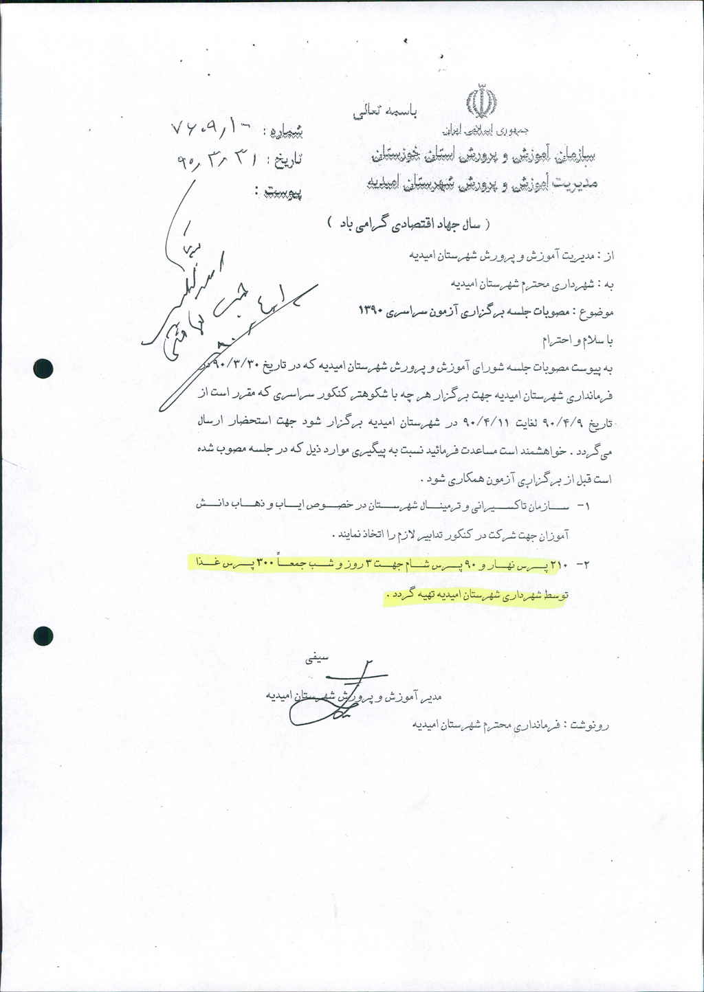 نامه شماره فوق شهرداری مبنی بردرخواست شماره ۱۰۰/ ۷۶۰۹ مورخ۳۱/ ۳/ ۹۰ آموزش وپرورش شهرستان امیدیه منضم به صورتجلسه شورای آموزش وپرورش در خصوص درخواست ۳۰۰پرس غذابرای ۳روزجهت اعضاء هیئت برگزار کننده کنکور سال ۱۳۹۰ ( از تاریخ ۹/ ۴/ ۹۰لغایت ۱۱/ ۴/ ۹۰) در جلسه مطرح و پس از بحث و بررسی با مجموع آراء ذیل مصوب گردید%