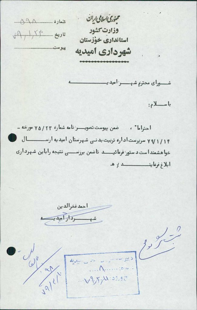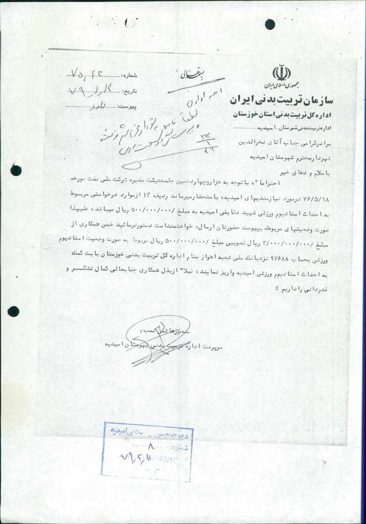 ۱-نامه شماره ۵۹۸ مورخ ۲۳/ ۱/ ۷۹شهرداري در خصوص درخواست اداره تربيت بدني مقرر شد مبلغ ياد شده به حساب شهرداري واريز و پس از انجام كار و ارائه صورت وضعيت به شهرداري با مجوز شوراي شهر به تربيت بدني داده شود.