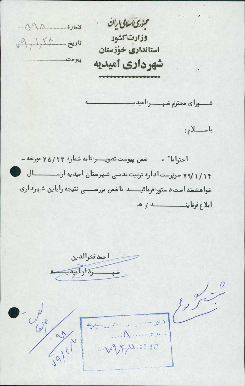 مصوبه شماره ۱ جلسه شماره ۹۸ شورای اسلامی شهر امیدیه
