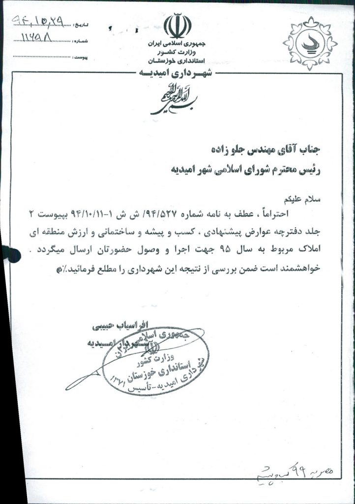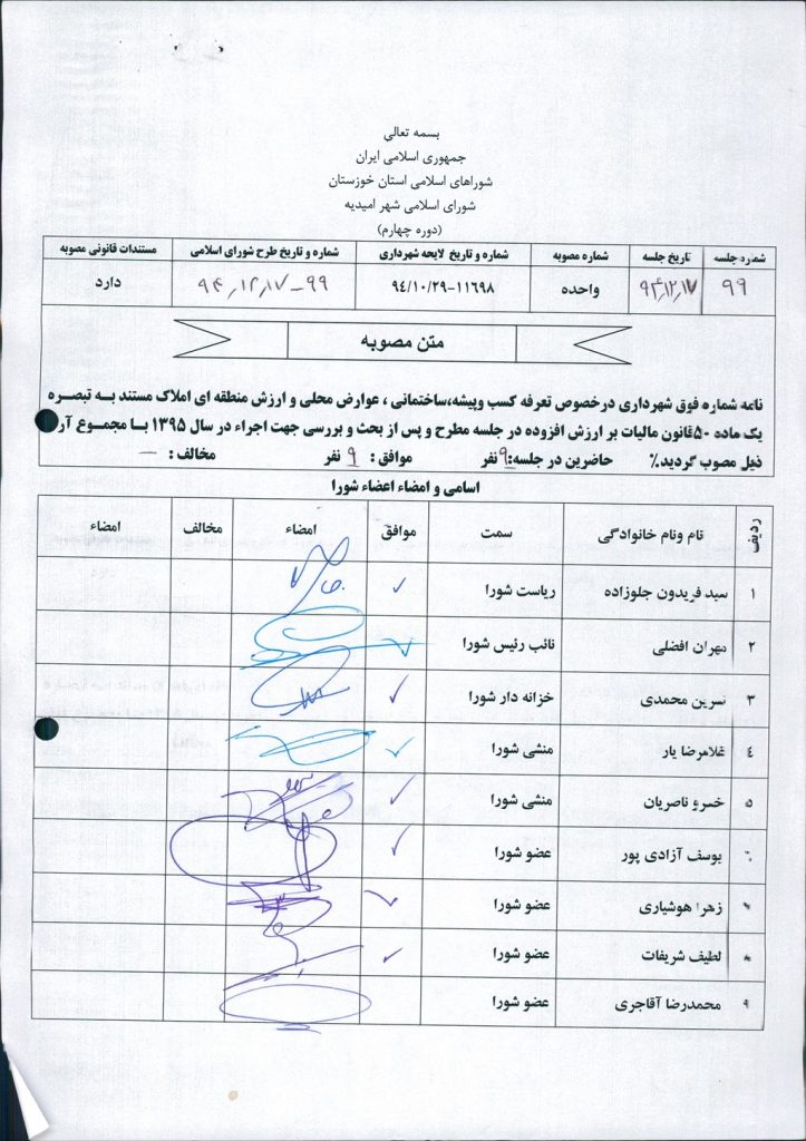 مصوبه شماره ۱ جلسه شماره ۹۹ شورای اسلامی شهر امیدیه