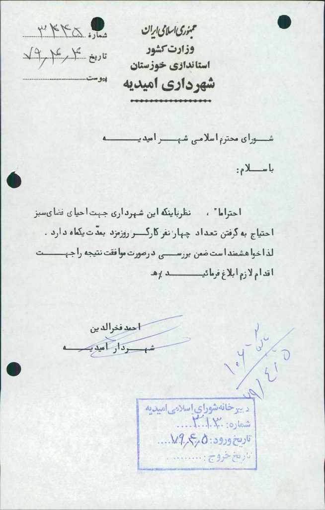 ۱۰-نامه شماره ۳۴۴۵مورخ ۴/۴/ ۷۹شهرداري در خصوص بكارگيري ۴ نفر كارگر روزمزد بمدت يكماه مطرح و با ۶ رأي موافق به تصويب رسيد.