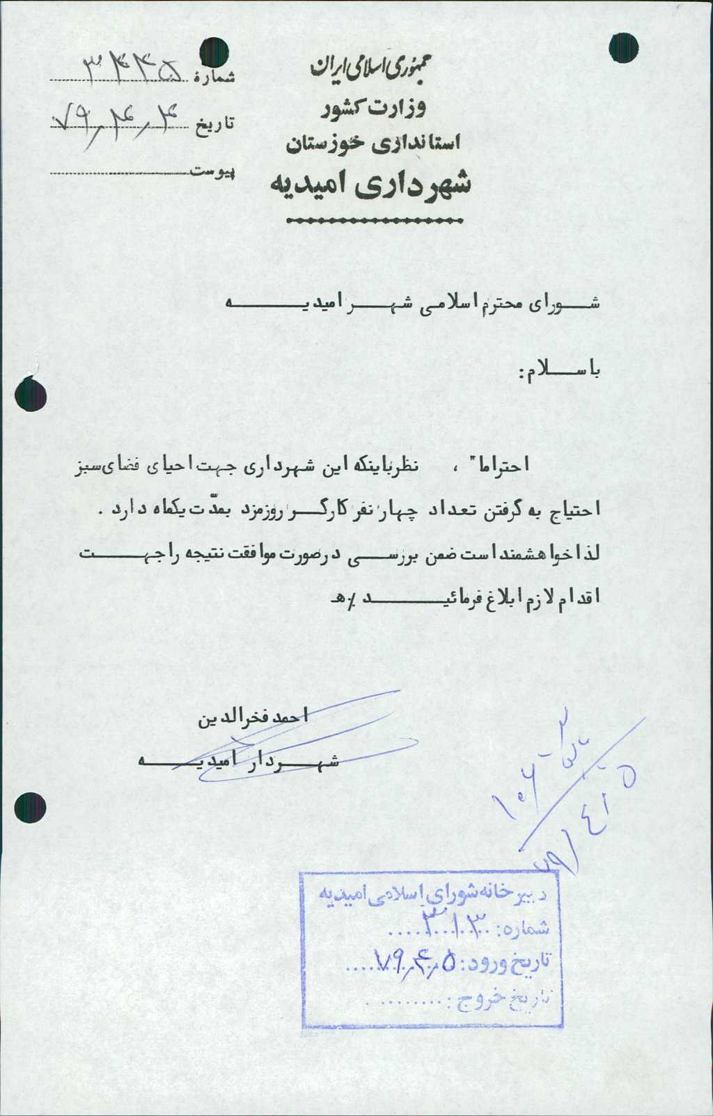 مصوبه شماره ۱۰ جلسه شماره ۱۰۶ مورخ ۷۹/۴/۵ شورای اسلامی شهر امیدیه