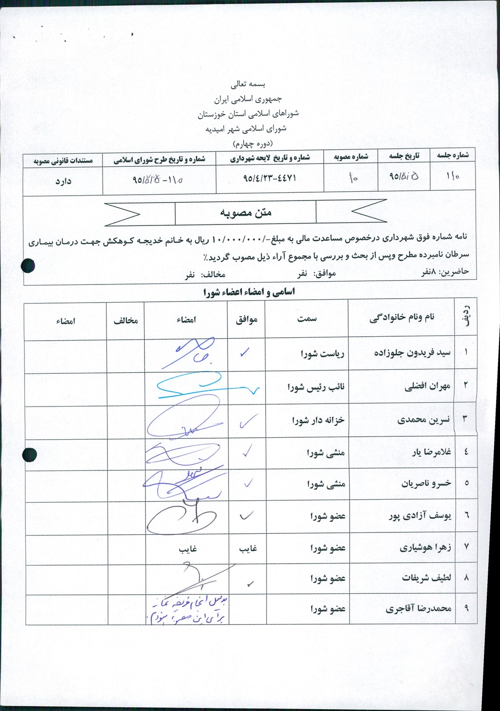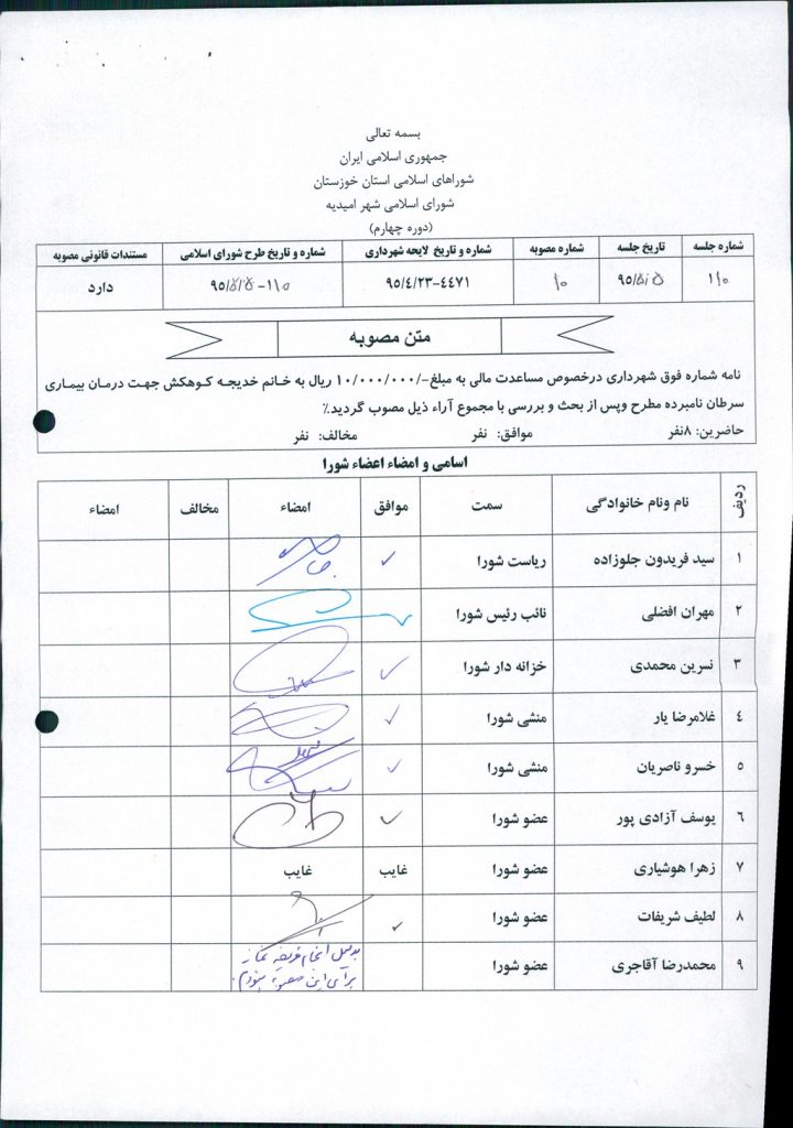 مصوبه شماره ۱۰ جلسه شماره ۱۱۰ شورای اسلامی شهر امیدیه