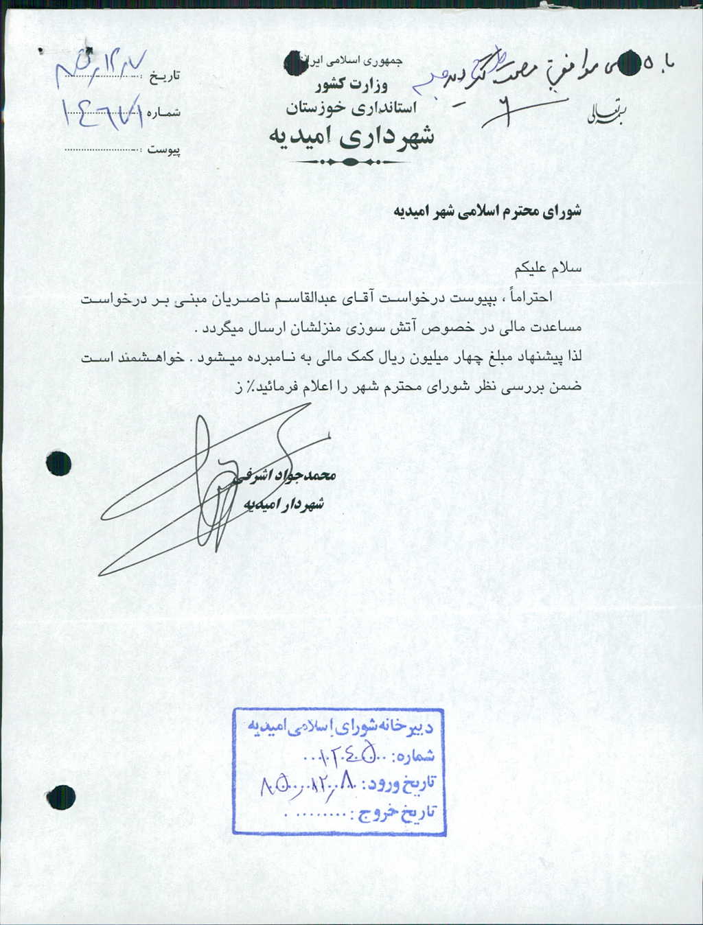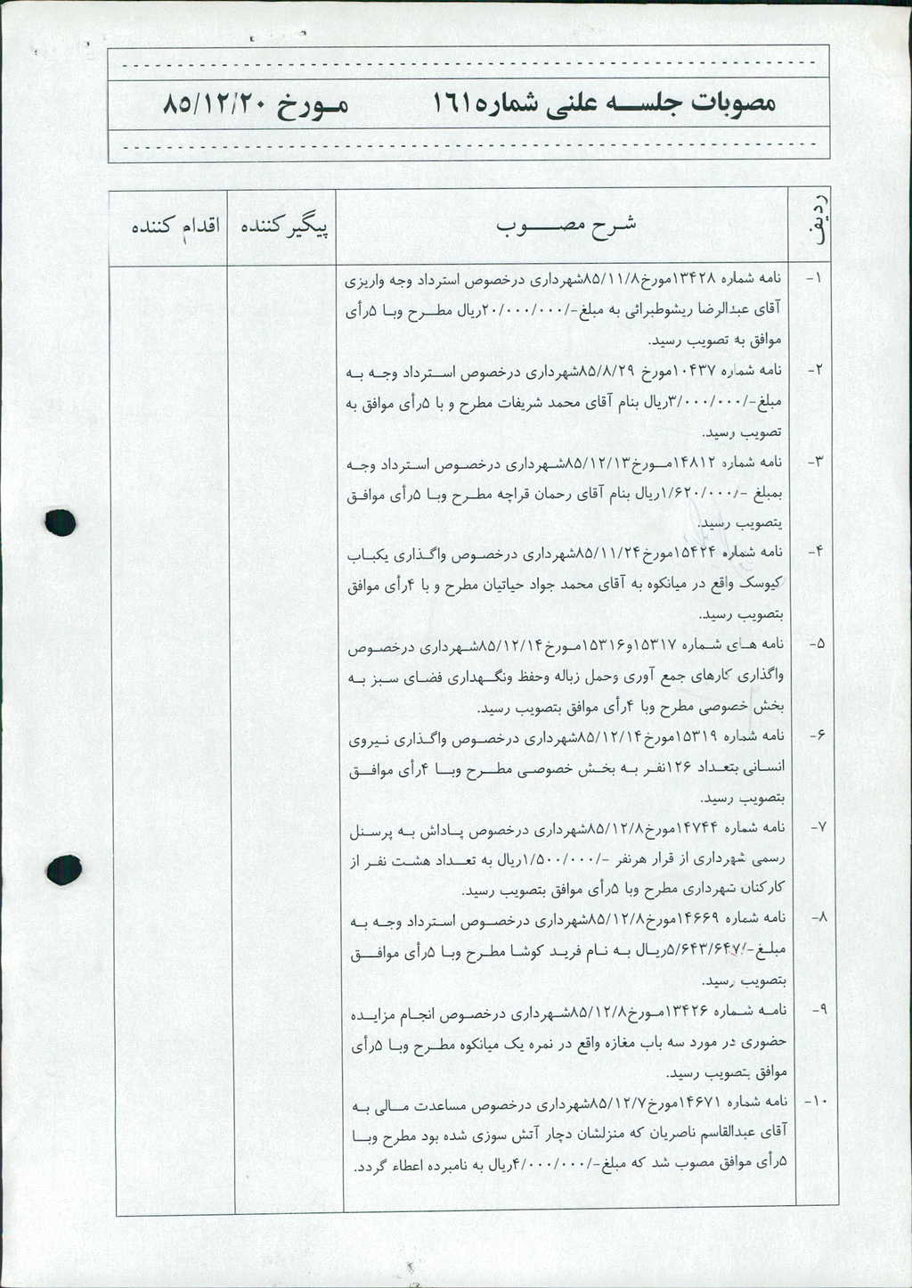 ۱۰-نامه شماره ۱۴۶۷۱مورخ۷/ ۱۲/ ۸۵شهرداري درخصوص مساعدت مالي به آقاي عبدالقاسم ناصريان كه منزلشان دچار آتش سوزي شده بود مطرح وبا ۵رأي موافق مصوب شد كه مبلغ-/۰۰۰/۰۰۰/ ۴ريال به نامبرده اعطاء گردد.