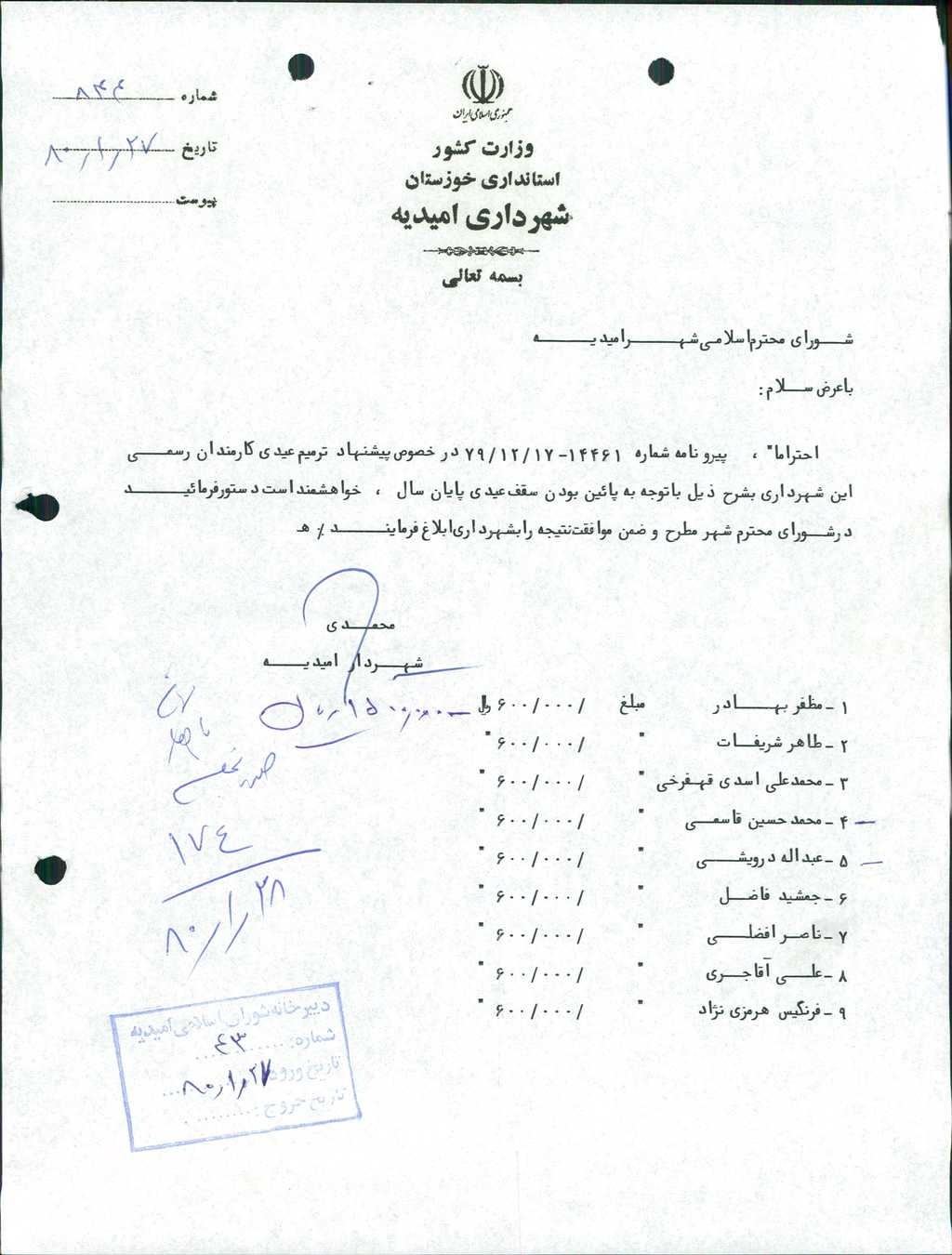 ۱۰-نامه شماره ۸۴۴-۲۷/ ۱/ ۸۰ شهرداری در خصوص پیشنهاد ترمیم عیدی کارمندان رسمی شهرداری با توجه به پائین بودن سقف عیدی پایان سال مطرح و با تعداد ۶ رأی موافق مقرر گردید به افراد نامبرده هرکدام مبلغ -/۰۰۰/ ۶۰۰ ریال به عنوان پاداش اعطاء گردد:۱-مظفر بهادر۲-طاهرشریفات۳-محمدعلی اسدی قهفرخی۴- جمشید فاضل۵-ناصر افضلی ۶-علی آقاجری ۷-فرنگیس هرمزی نژاد.