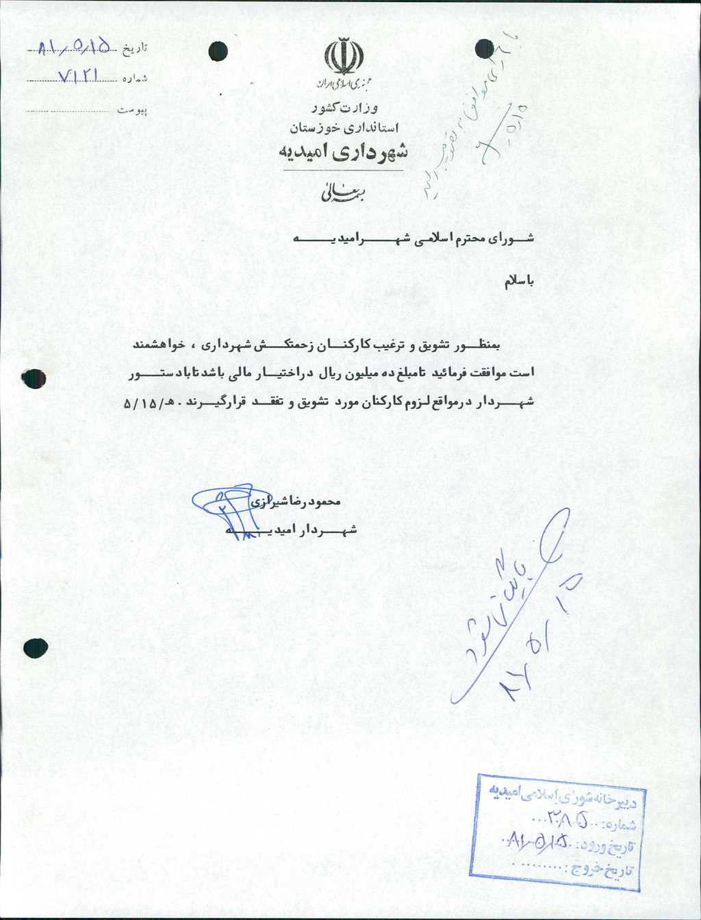 مصوبه شماره ۱۰ جلسه شماره ۲۸۵ شورای اسلامی شهر امیدیه