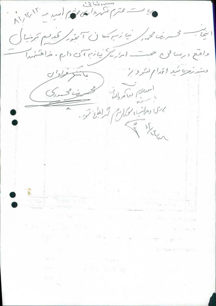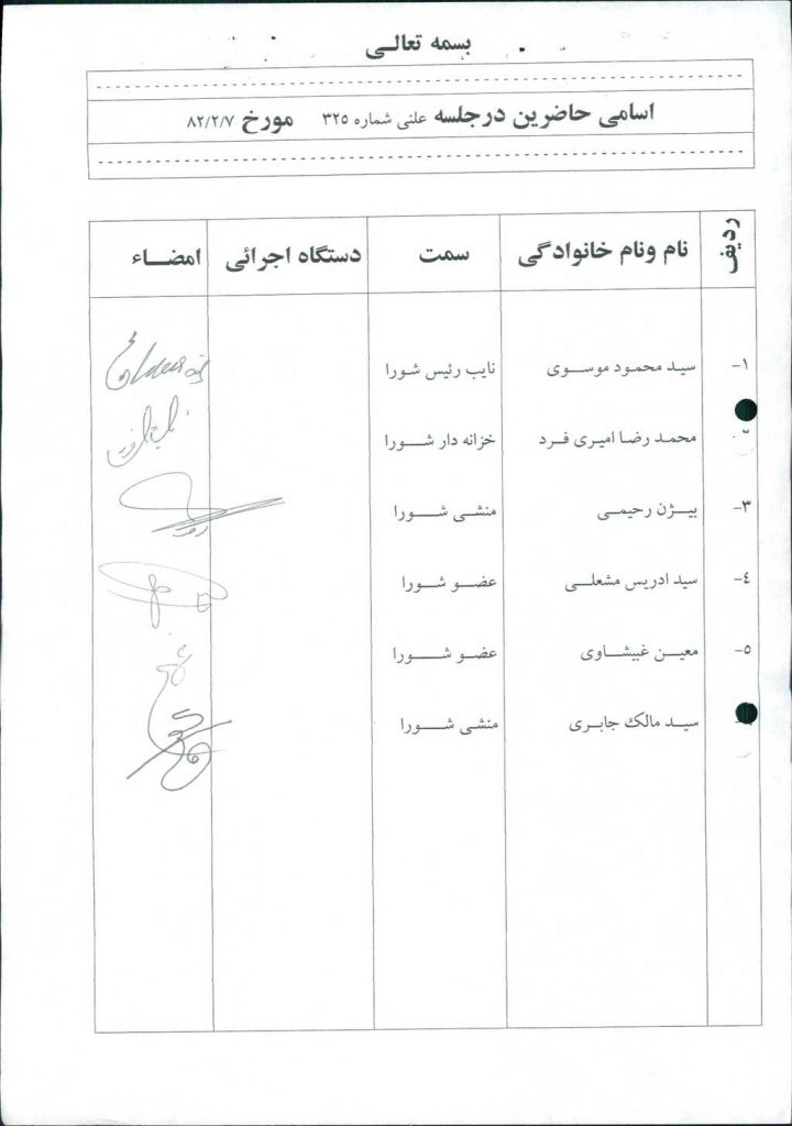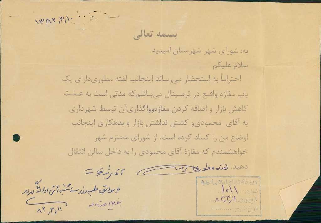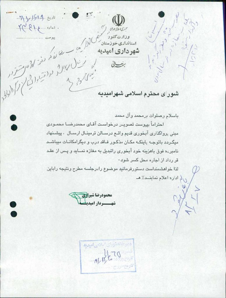 ۱۰-نامه شماره ۲۳۴۱۴-۱۸/ ۱۲/ ۸۱شهرداري مبني بر واگذاري آبخوري قديـم واقع در سالن ترمينال به آقاي محمد رضا محمودي قرائت و با ۶رأي مخالف به تصويب نرسيد ومقررگرديد يك باب مغازه در ترمينال به وي واگذار شود.