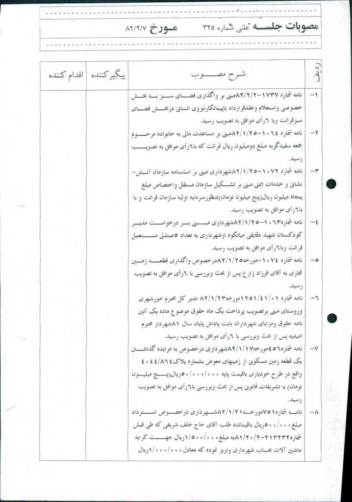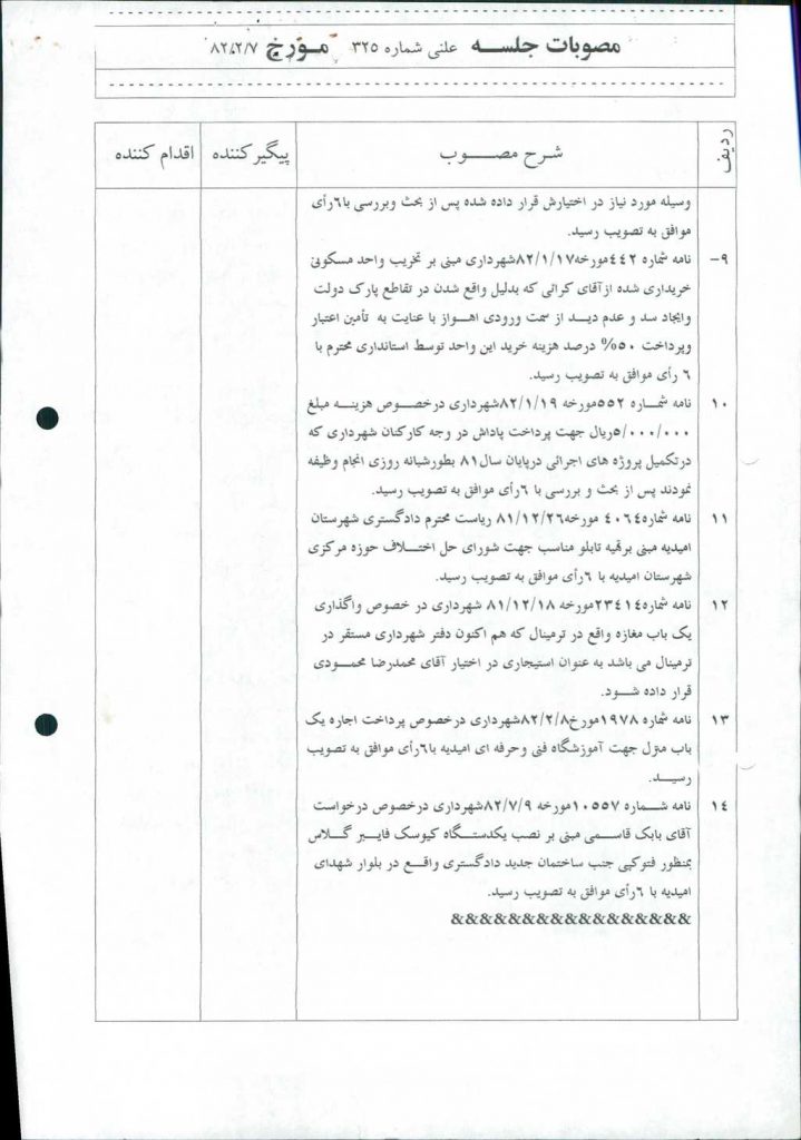 مصوبه شماره ۱۰ جلسه شماره ۳۱۷ شورای اسلامی شهر امیدیه