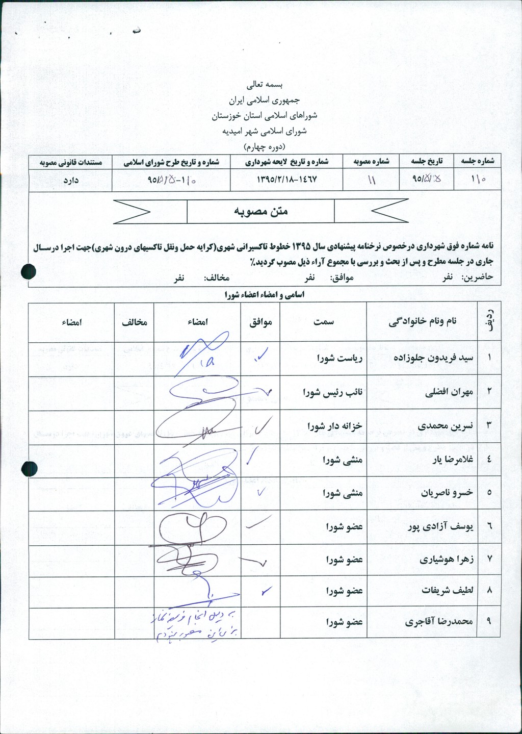 مصوبه شماره ۱۱ جلسه شماره ۱۱۰ مورخ ۹۵/۵/۵ شورای اسلامی شهر امیدیه