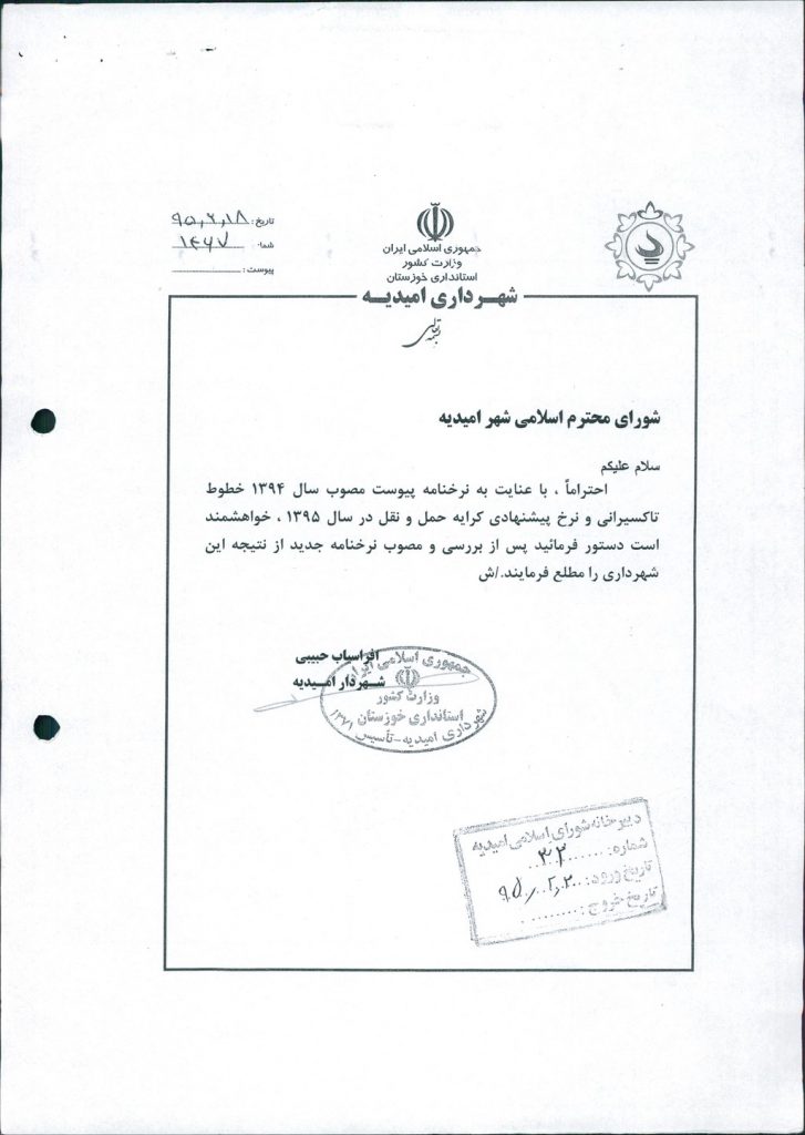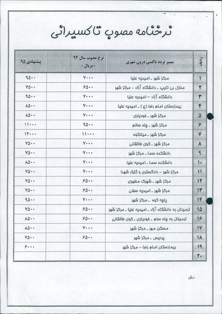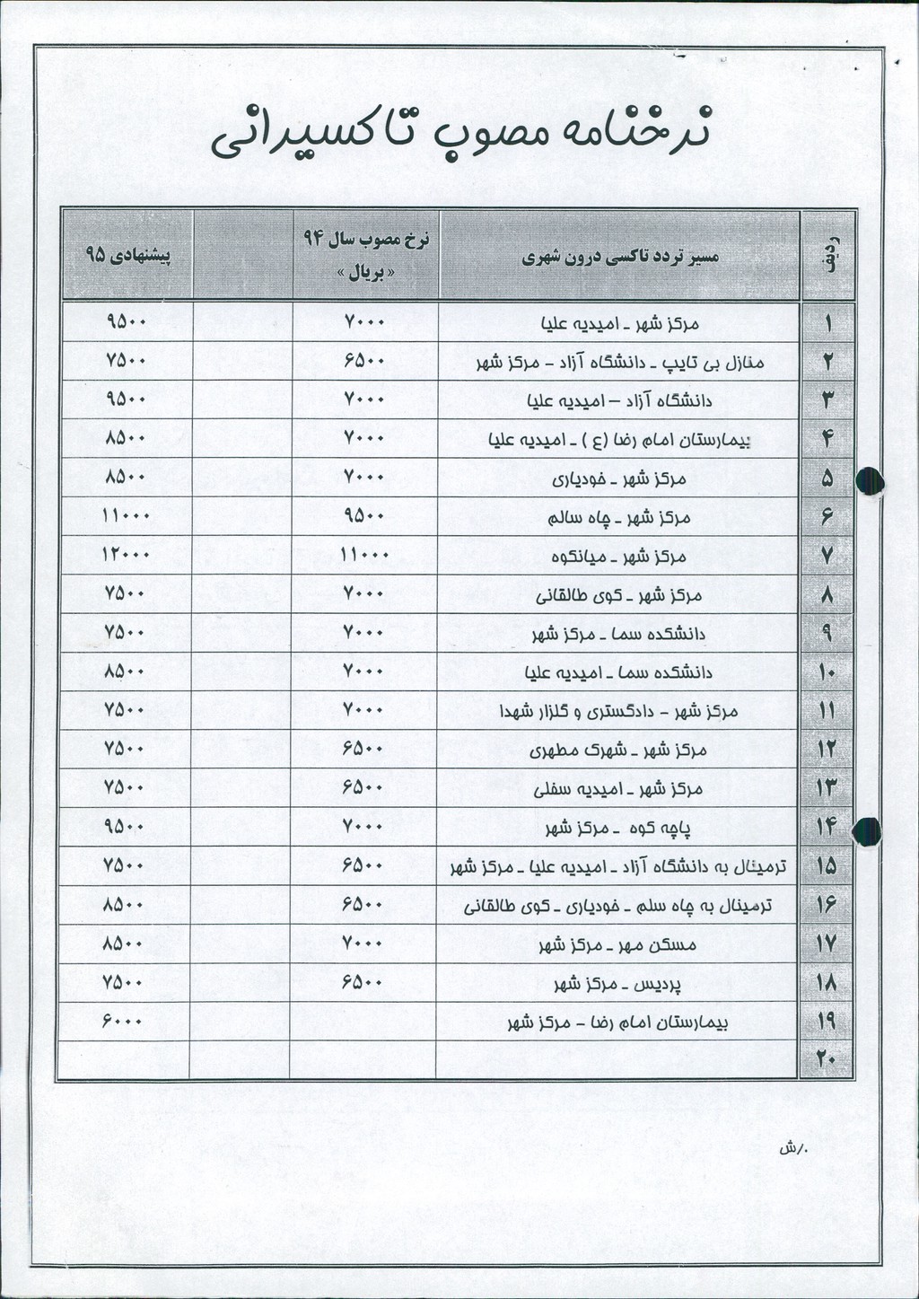 نامه شماره فوق شهرداری در خصوص نرخنامه پیشنهادی سال ۱۳۹۵ خطوط تاکسیرانی شهری (کرایه حمل و نقل تاکسیهای درون شهری) جهت اجرا در سال جاری در جلسه مطرح و پس از بحث و بررسی با مجموع آراء ذیل مصوب گردید%
