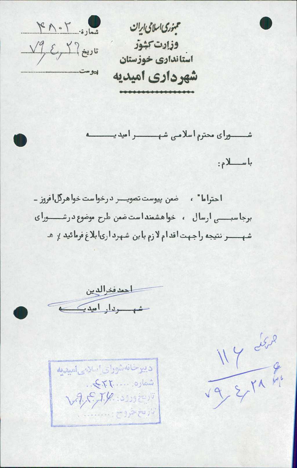 مصوبه شماره ۱۱ جلسه شماره ۱۱۶ مورخ ۷۹/۴/۲۸ شورای اسلامی شهر امیدیه