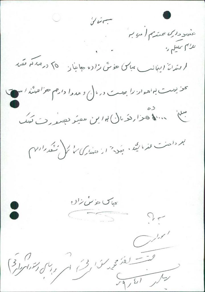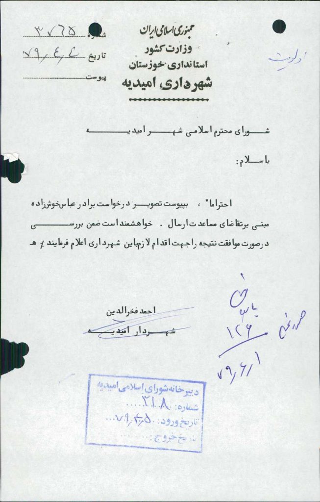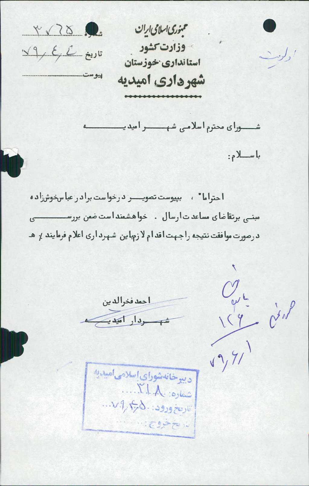 ۱۱-نامه شماره ۳۷۶۵ مورخه ۴/۴/ ۷۹ در خصوص مساعدت به آقاي عباس خوش زاده به مبلغ -/۰۰۰/ ۱۰۰ ريال مطرح و مقرر گرديد مبلغ فوق الذكر به مشاراليه پرداخت گردد.