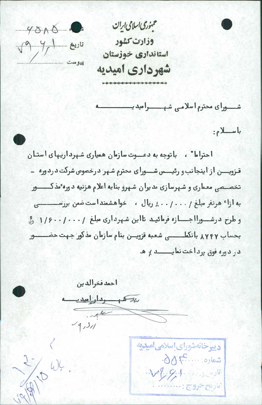 ۱۱-نامه شماره۶۵۸۵مورخه ۱/ ۶/ ۷۹ شهرداري در خصوص شركت دو نفر در دوره تخصصي معماري و شهرسازي مديران شهرو واريز مبلغ -/۰۰۰/ ۶۰۰/ ۱ ريال بحساب ۸۷۴۷ بانك ملي شعبه قزوين مطرح و با ۵رأي موافق به تصويب رسيد.