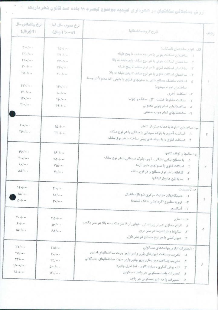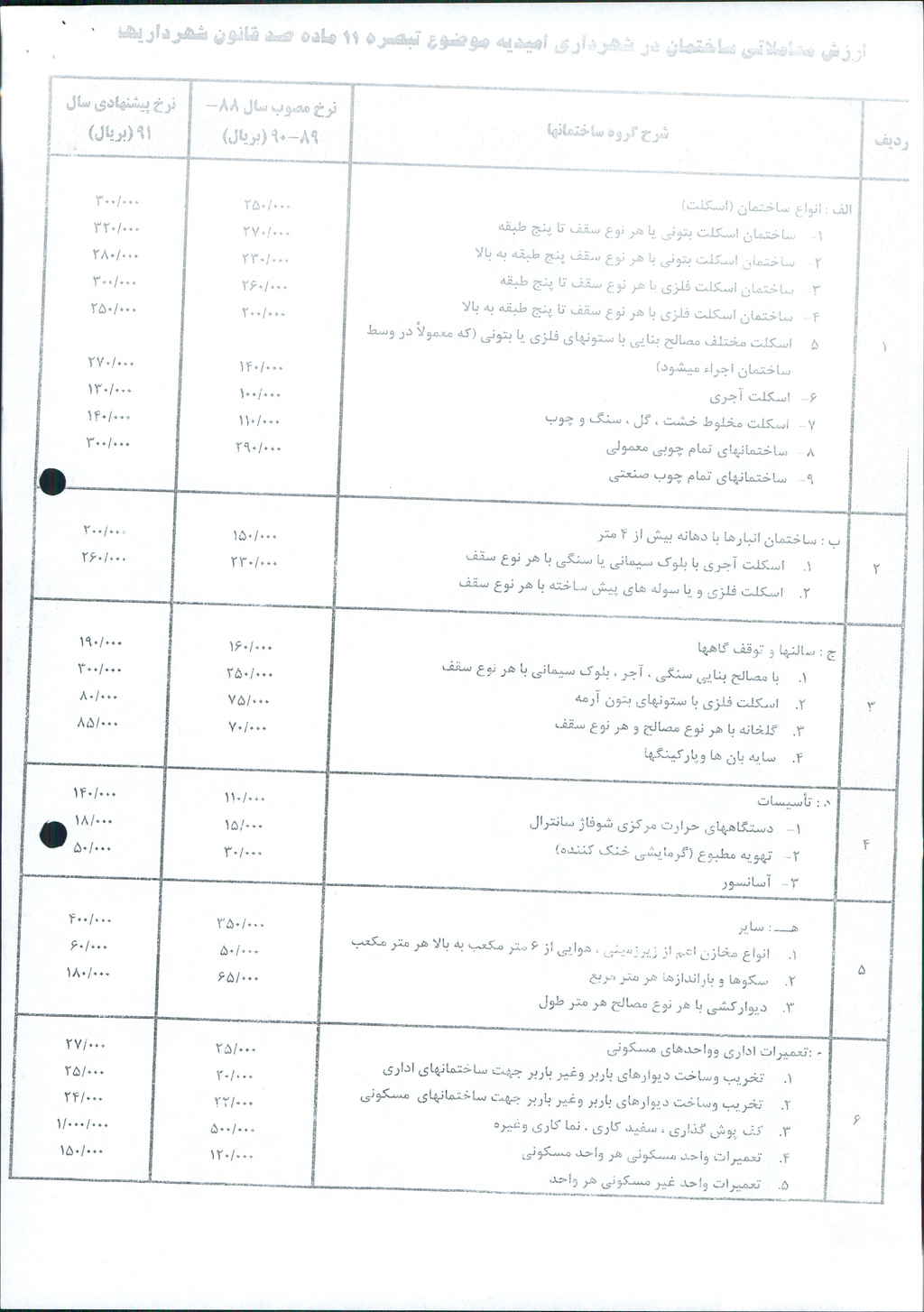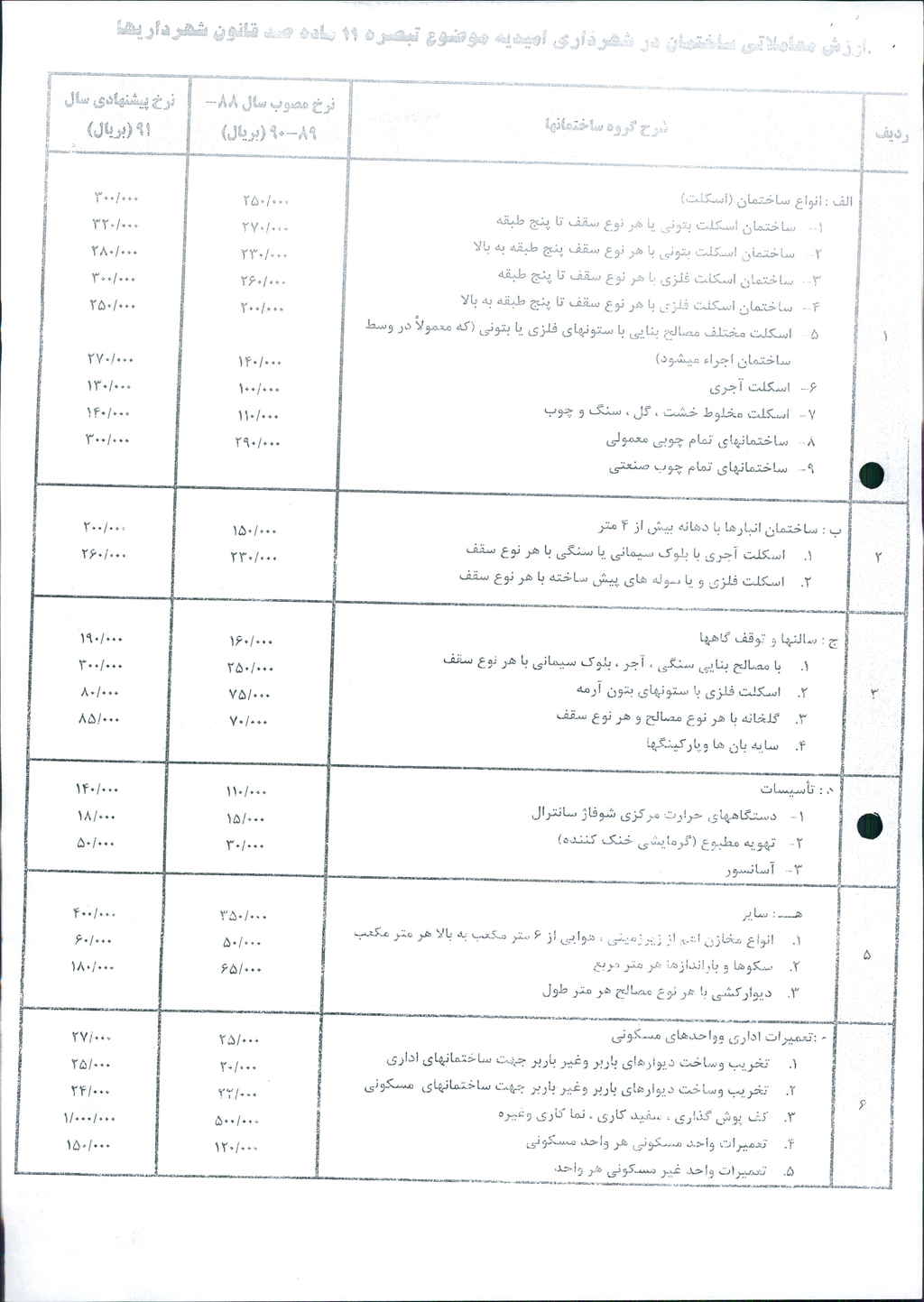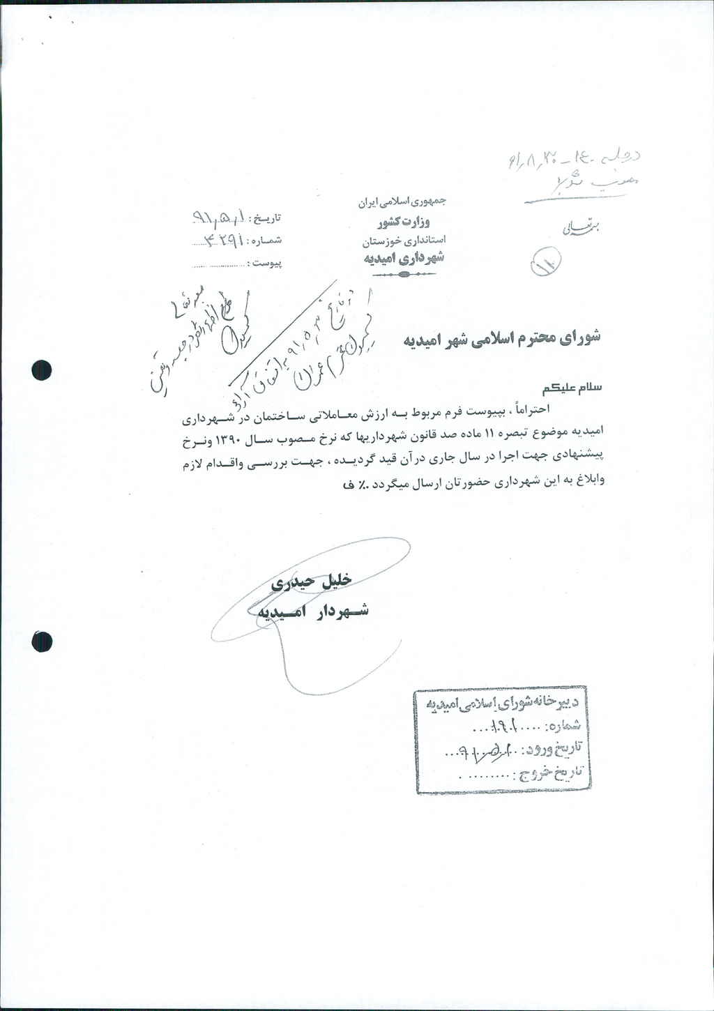 نامه شماره فوق شهرداری در خصوص تصویب ارزش معاملاتی ساختمانی در شهرداری امیدیه موضوع تبصره ۱۱ ماده صد قانون شهرداریها نرخ پیشنهادی جهت اجرا در سال جاری مطرح و با مجموع آراء ذیل مصوب گردید%