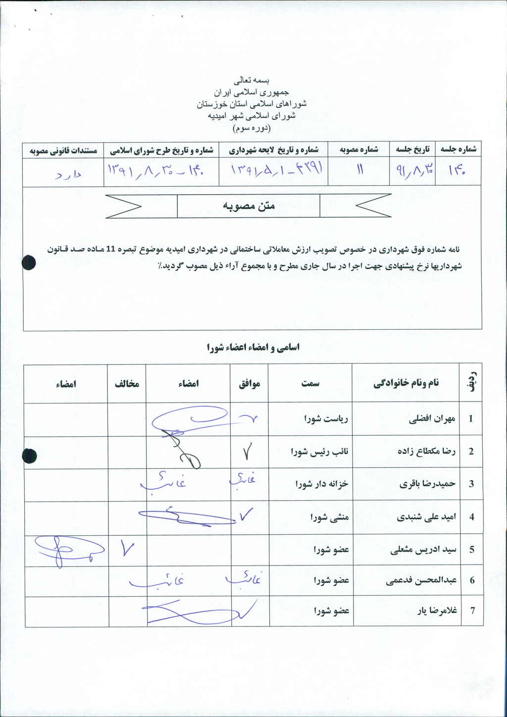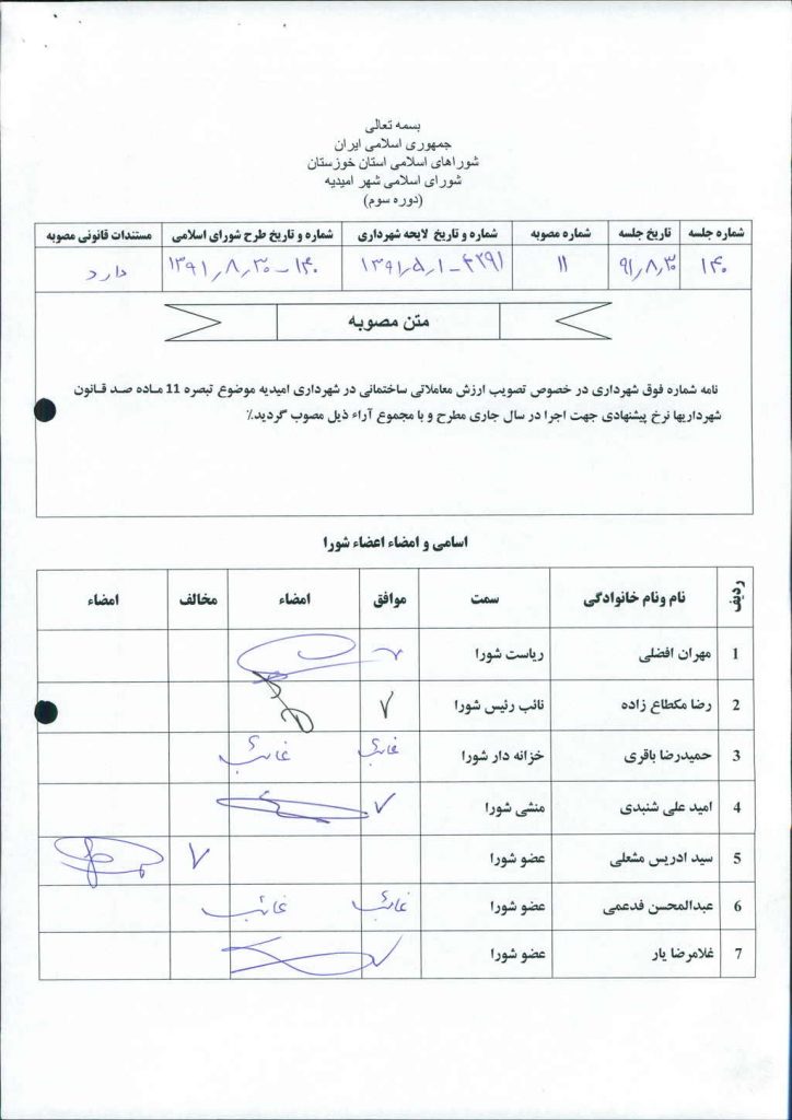 مصوبه شماره ۱۱ جلسه شماره ۱۴۰ شورای اسلامی شهر امیدیه