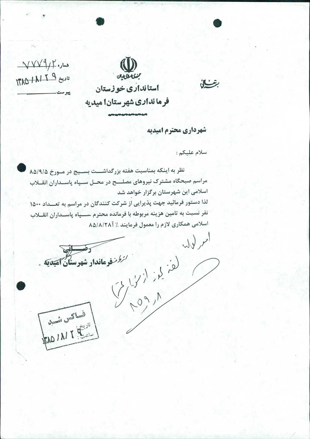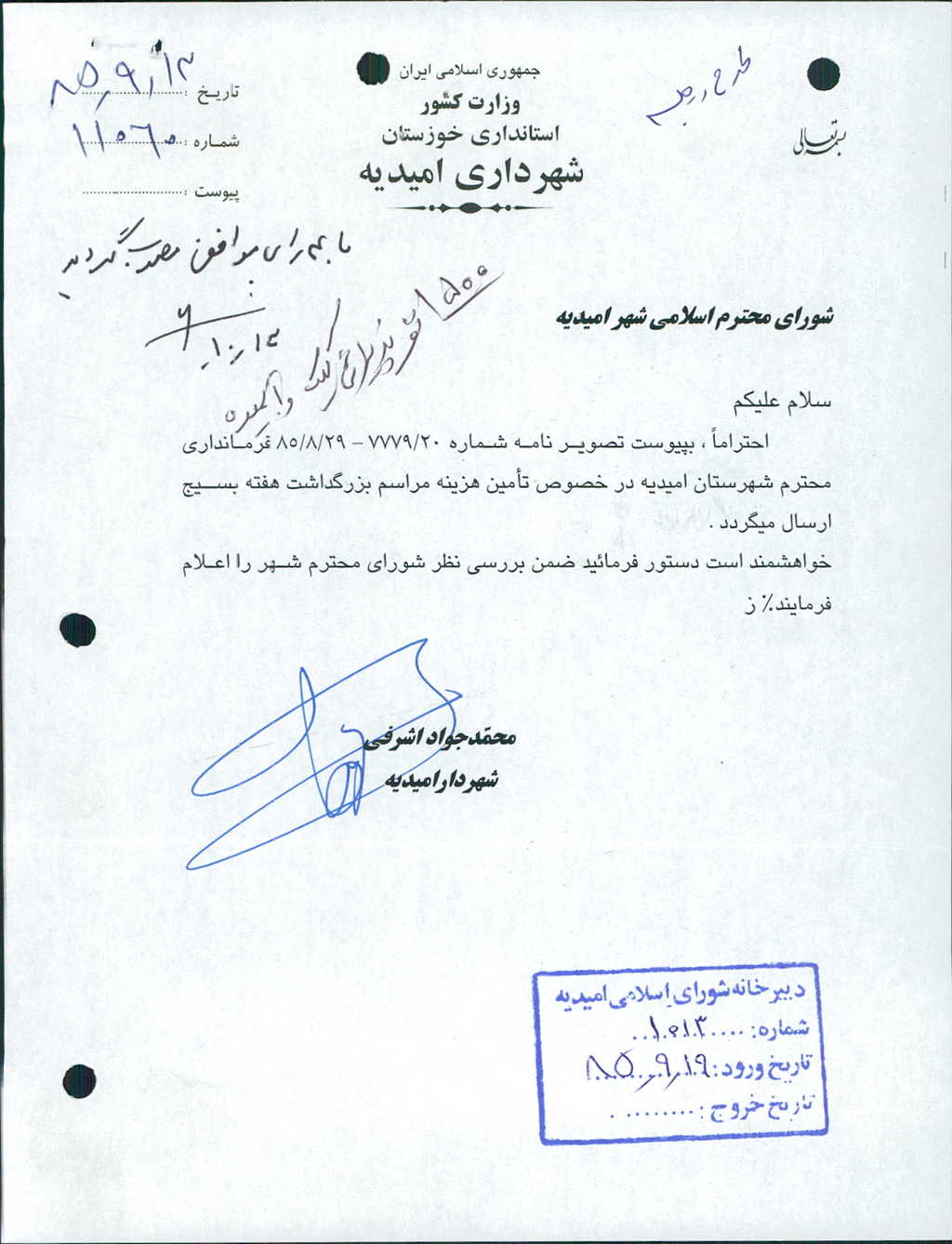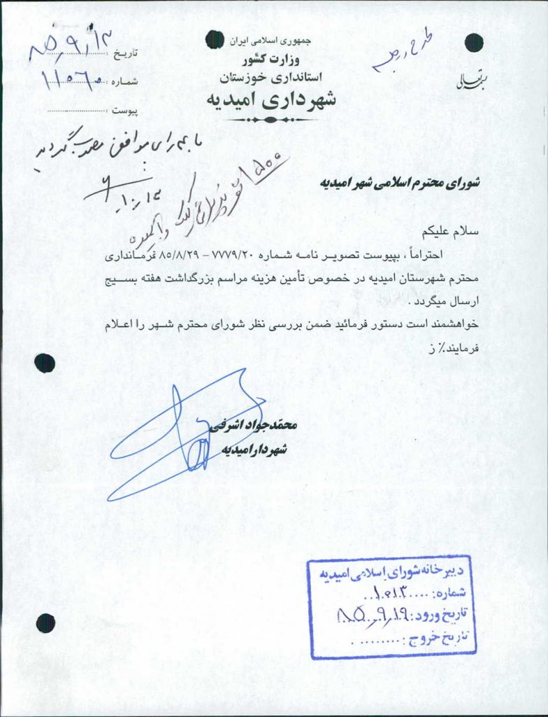 ۱۱-نامه شماره ۱۱۰۶۰-۱۳/ ۹/ ۸۵شهرداري درخصوص تأمين هزينه پذيرائي ۱۵۰۰نفر در مراسم بزرگداشت هفته بسيج بود كه با ۴رأي موافق مصوب گرديد.
