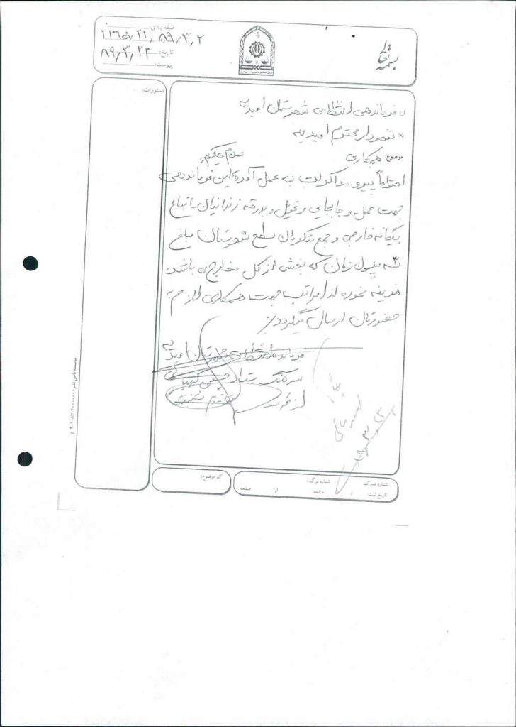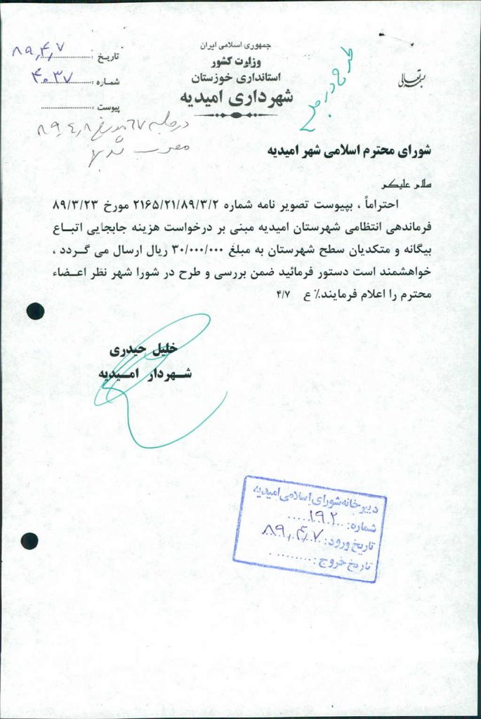 نامه شماره فوق در خصوص درخواست فرماندهی انتظامی شهرستان امیدیه مبنی بر پرداخت هزینه جابجایی اتباع بیگانه و متکدیان سطح شهرستان به مبلغ ۳۰/۰۰۰/۰۰۰ ریال بود که پس از بحث و بررسی با مجموع آراء ذیل مصوب گردید%