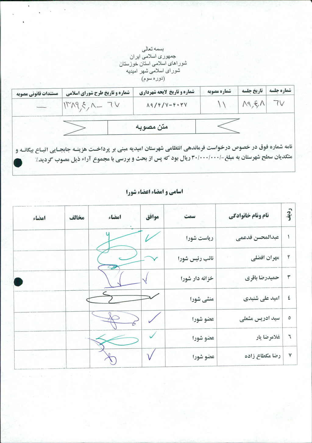 مصوبه شماره ۱۱ جلسه شماره ۶۷ شورای اسلامی شهر امیدیه