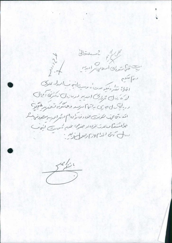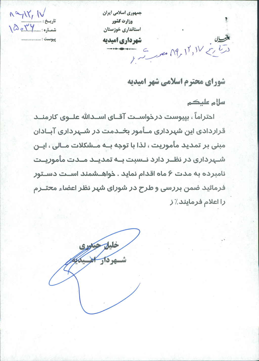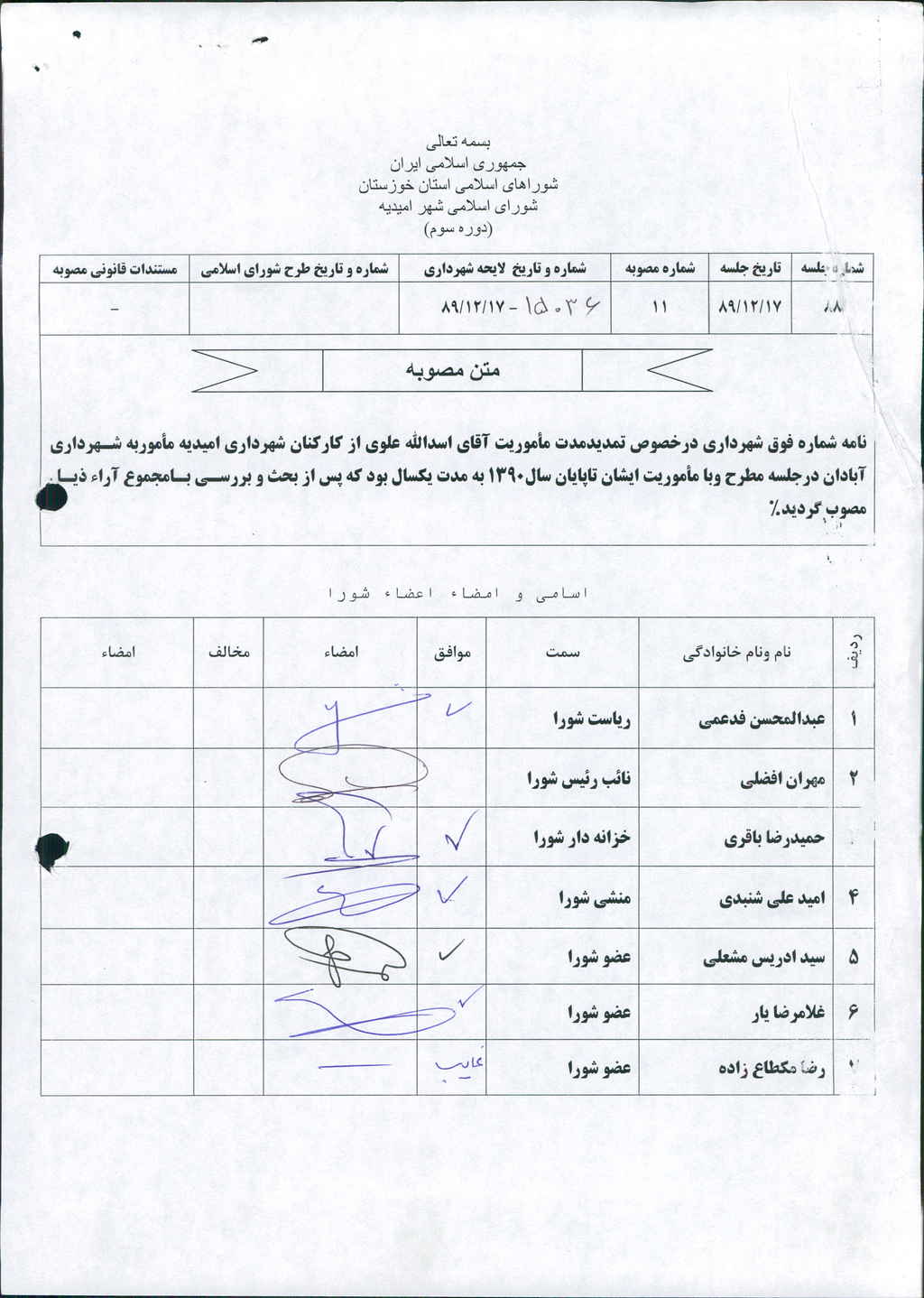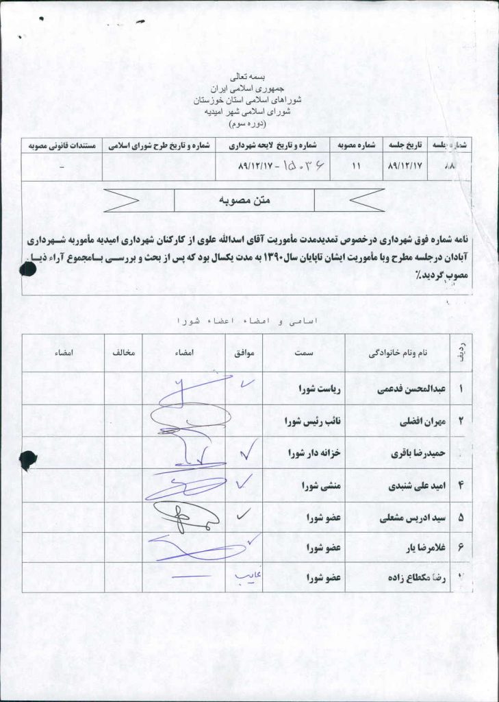 نامه شماره فوق شهرداری درخصوص تمدیدمدت مأموریت آقای اسدالله علوی از کارکنان شهرداری امیدیه مأمور به شهرداری آبادان درجلسه مطرح وبا مأموریت ایشان تاپایان سال۱۳۹۰ به مدت یکسال بود که پس از بحث و بررسی بامجموع آراء ذیل مصوب گردید%