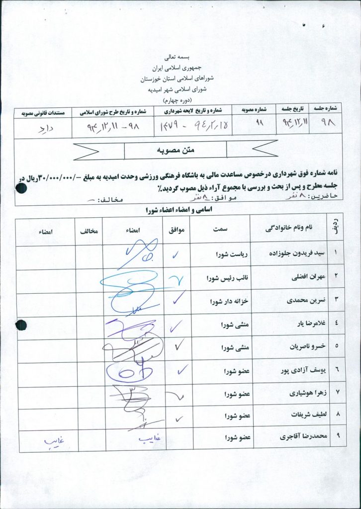 مصوبه شماره ۱۱ جلسه شماره ۹۸ شورای اسلامی شهر امیدیه
